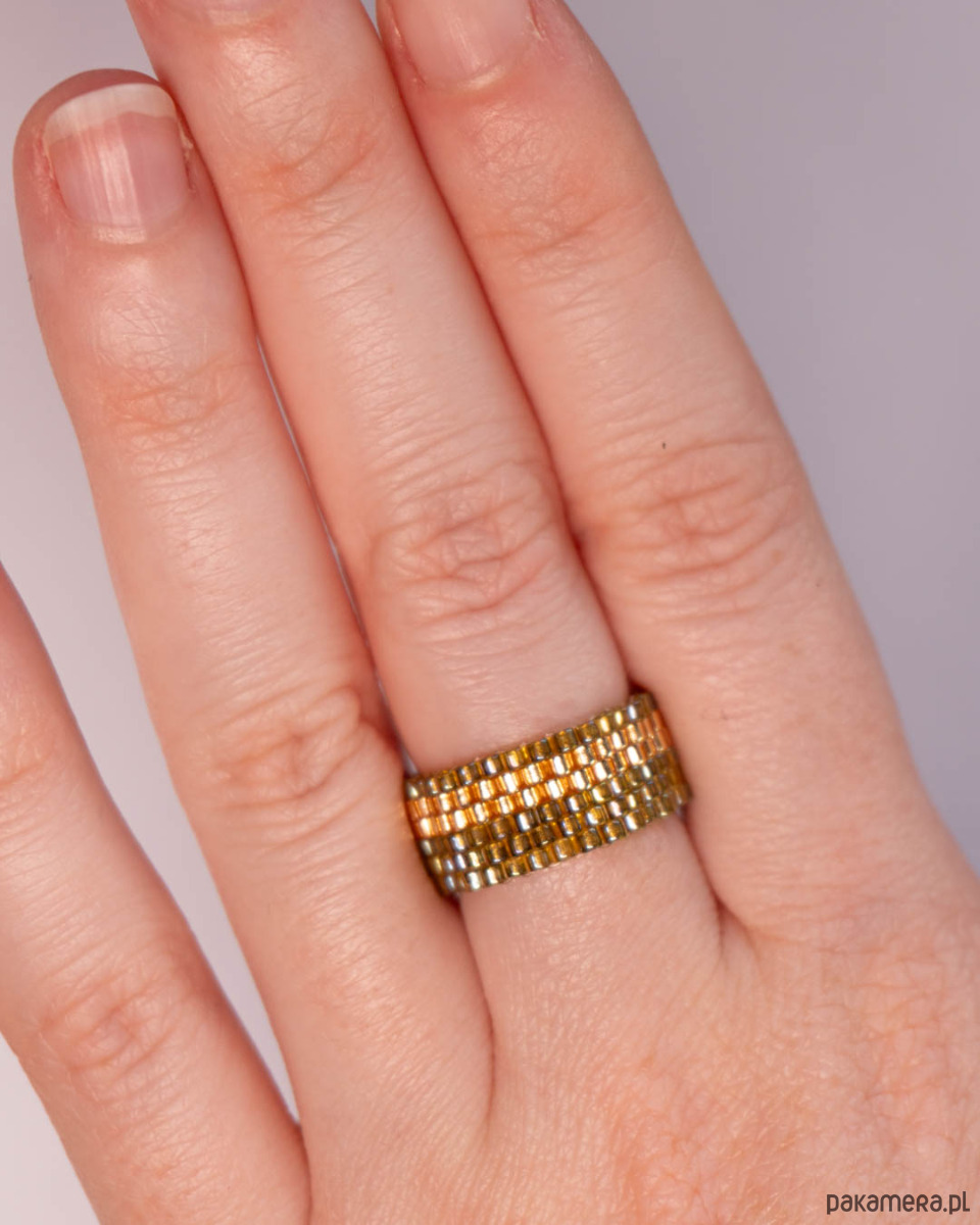 Pierścionek tkany ręcznie metodą peyote ze szklanych japońskich koralików Miyuki.