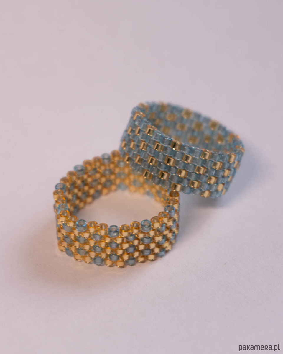 Pierścionek tkany ręcznie metodą peyote ze szklanych japońskich koralików Miyuki.