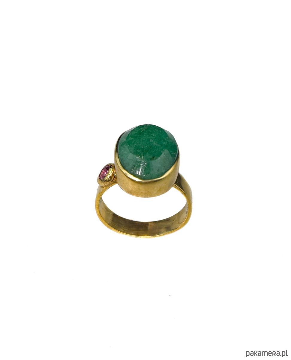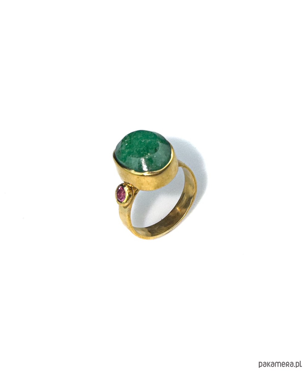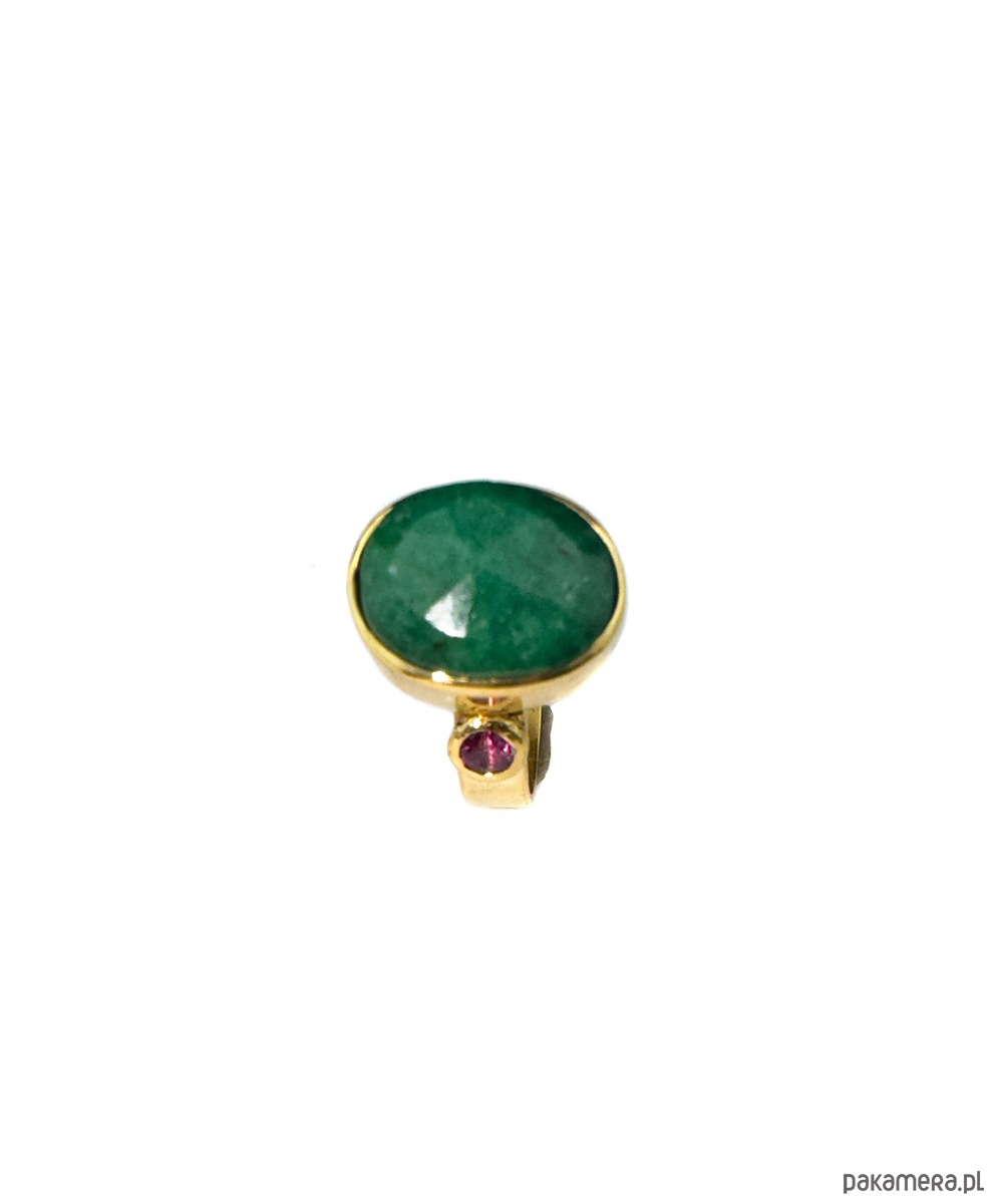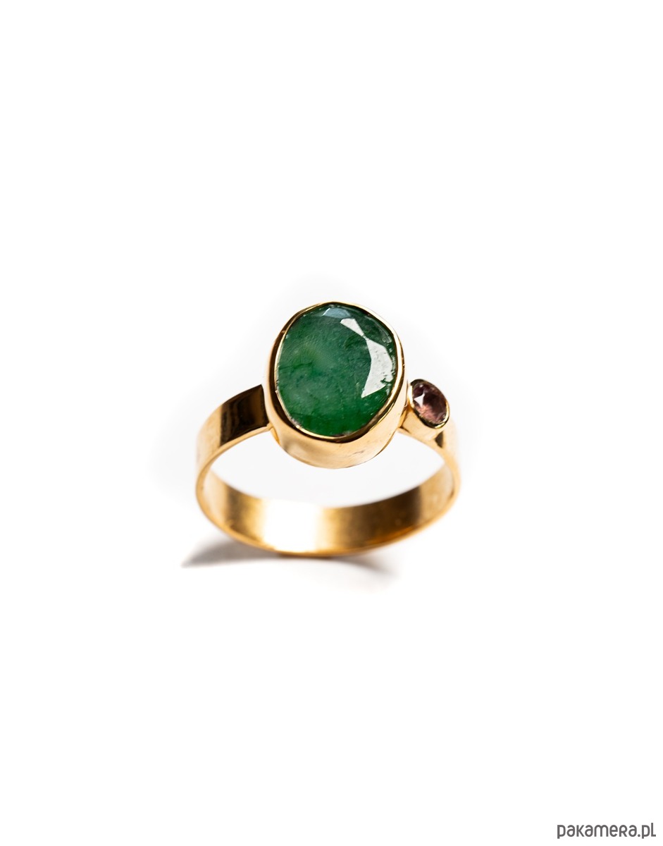 Kompozycja pokaźnych rozmiarów naturalnego, nieprzeźroczystego szmaragdu z małym, różowym turmalinem. Całość wykonana od podstaw ręcznie ze srebra 925, złoconego 24k złotem. Dostępna również wersja srebrna.