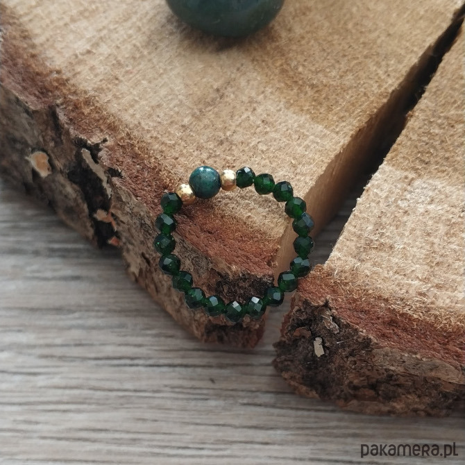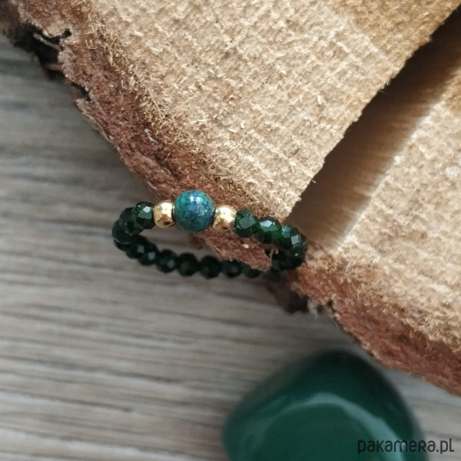 Inspirowany zielenią lasów tropikalnych pierścionek ze szmaragdem Nilu i azurytem. Fasetowane kamienie szmaragdu Nilu w odcieniu butelkowej zieleni pięknie odbijają światło, a nieco większa kuleczka azurytu dodaje odrobinę egzotycznego klimatu, łącząc w sobie zieleń z delikatnymi przebłyskami granatu i nieco nieregularną fakturą. Kamienie uzupełnione są ozdobnymi elementami ze stali szlachetnej w kolorze złotym.