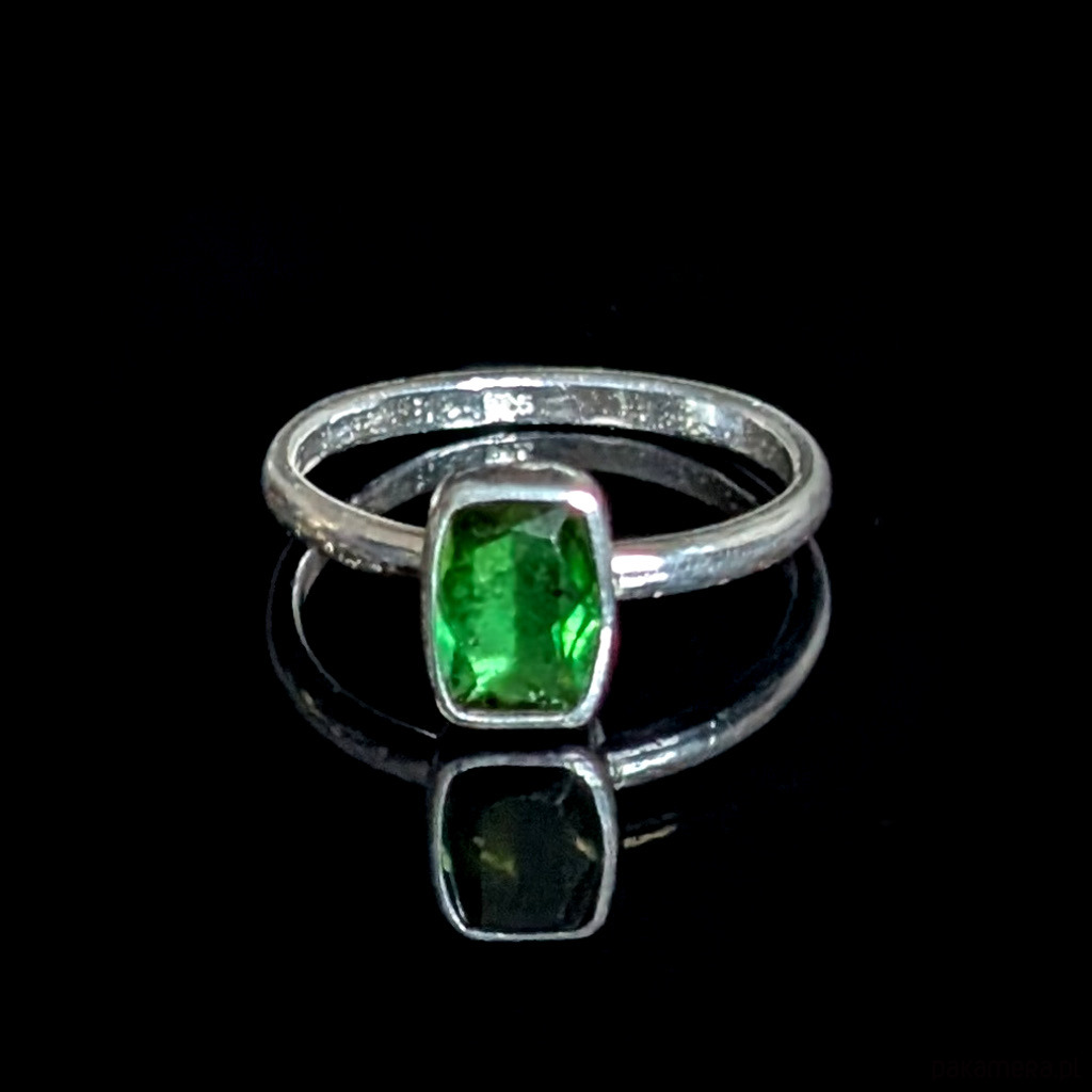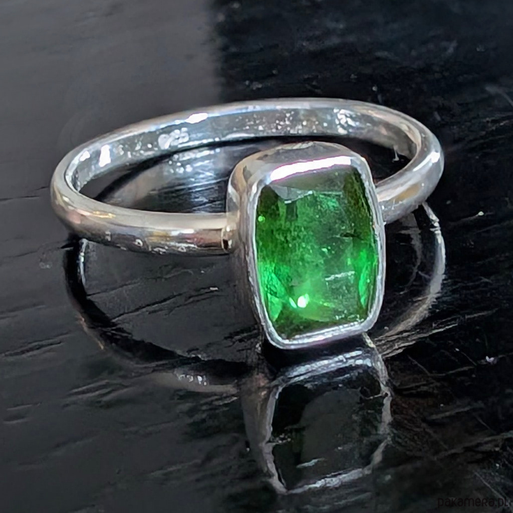 Retro pierścień z oprawionym w srebro próby 925 przepięknym zielonym turmalinem. Oprawa ma 9 x 7 mm. Rozmiar jubilerski 18, mogę powięszyć na max. 19. Waga 2,6grama. Pierścień zapakowany w ozdobne pudełeczko.