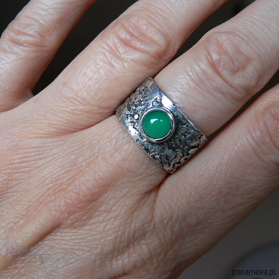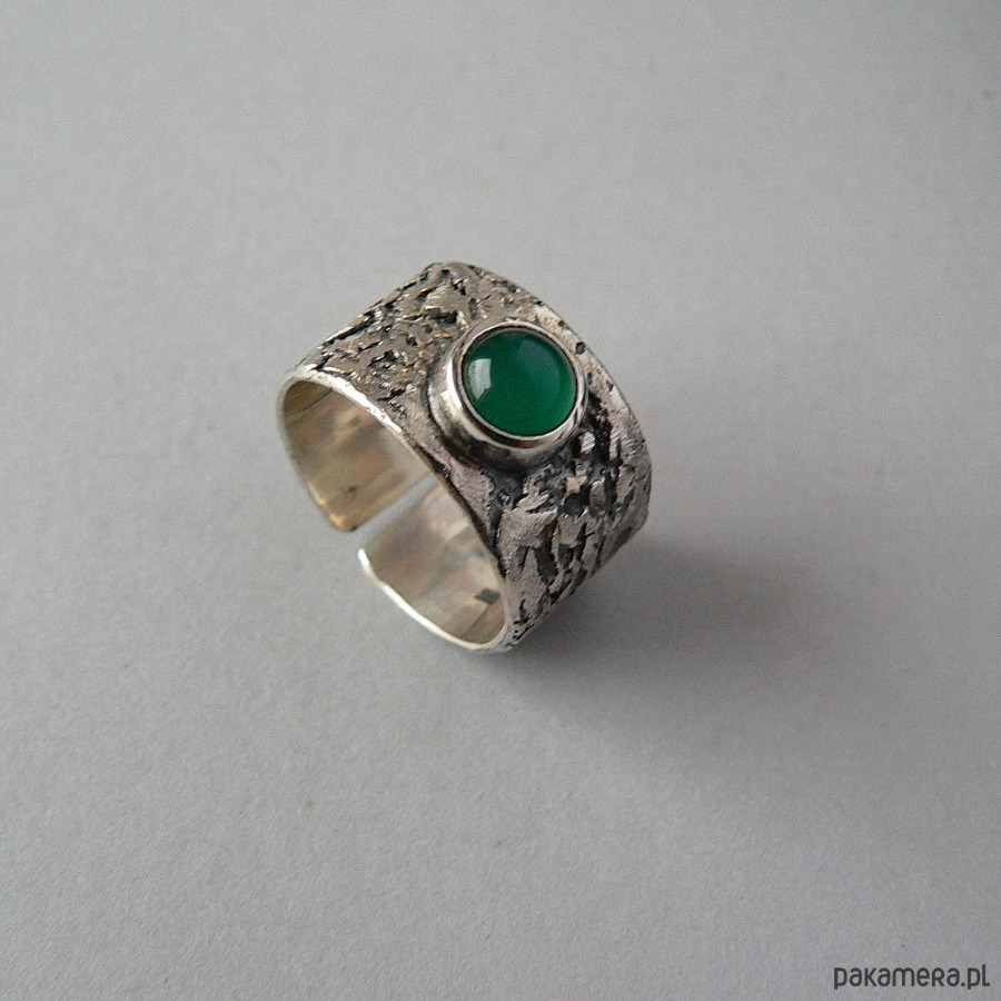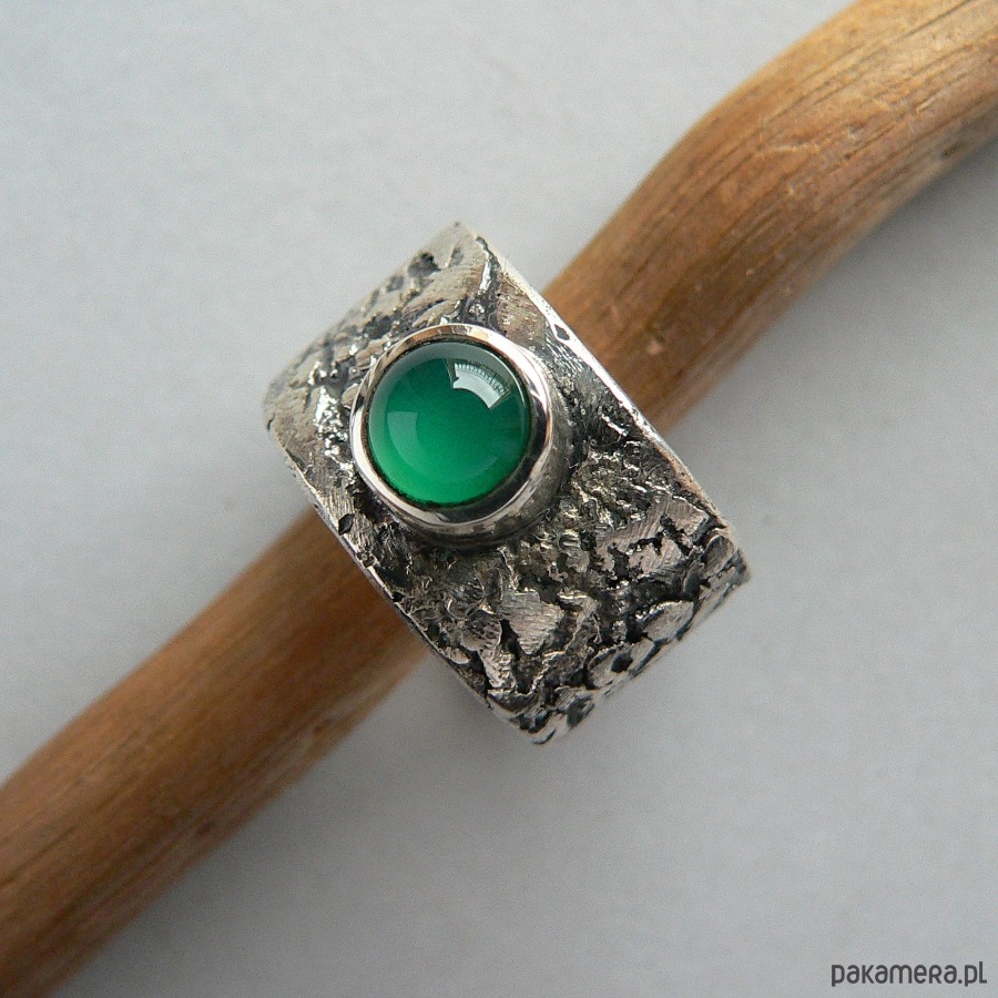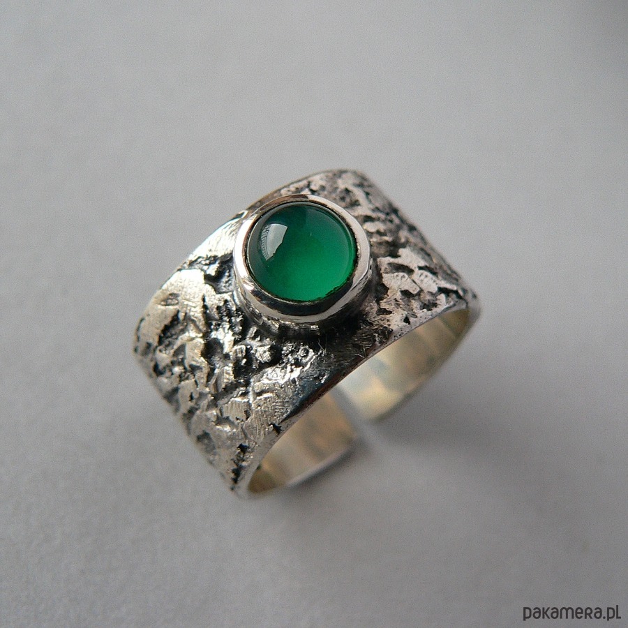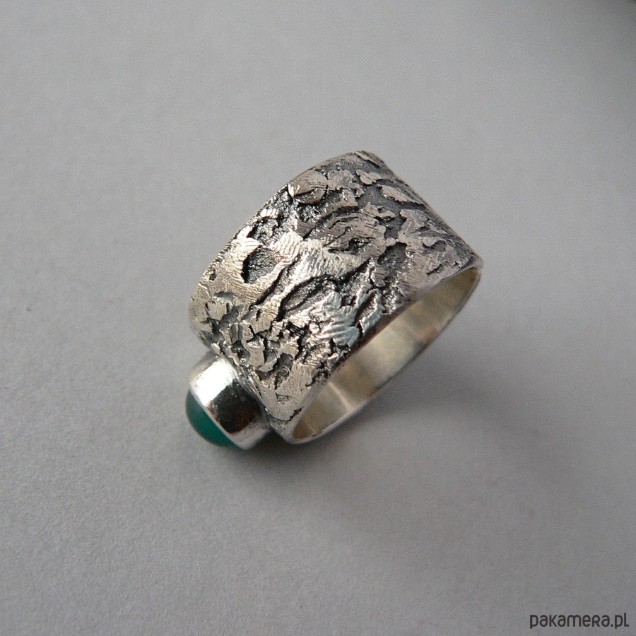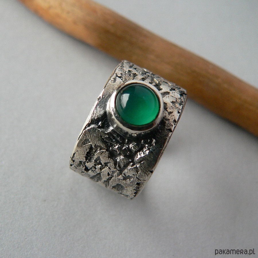 Surowy, rustykalny pierścionek wykonany ze srebra i zielonego agatu. Szeroka obrączka z formowanego ogniem, spękanego srebra. Całość oksydowana i przecierana, detale polerowane. Powierzchnia srebra mimo grubej, surowej faktury przyjazna dla skóry. Szerokość obrączki- 1,3 cm Średnica kamienia 7 mm Rozmiar 17, obrączka rozcięta, możliwość regulacji-powiększenia o jeden maksymalnie dwa rozmiary.