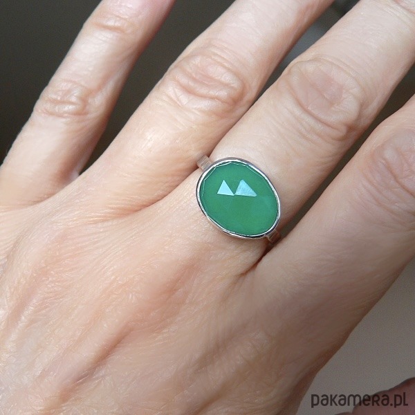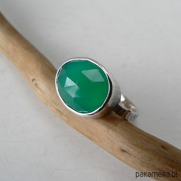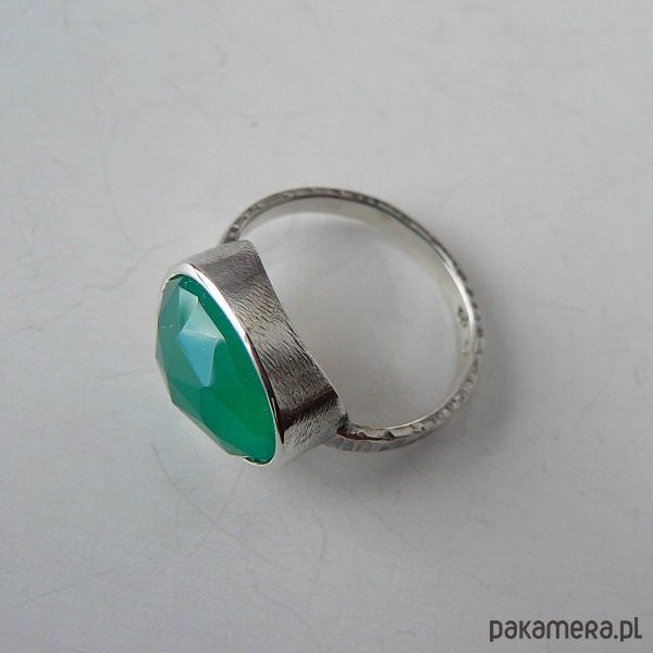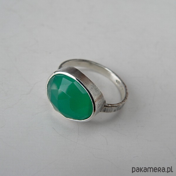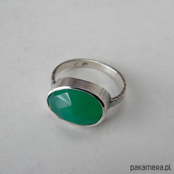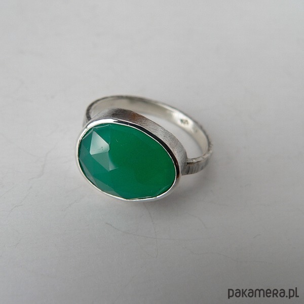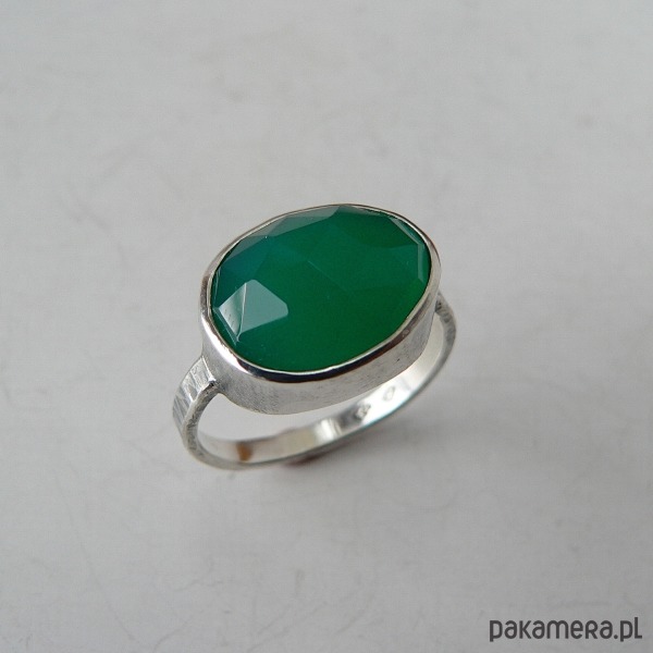 NA ZAMÓWIENIE, TERMIN REALIZACJI 7-8 DNI ROBOCZYCH. Minimalistyczny pierścionek wykonany ze srebra i owalnego, zielonego onyksu. Wymiary kamienia 15/12 mm, oprawa kamienia profilowana dzięki temu pierścionek ładnie leży na palcu. Srebro fakturowane, oksydowane i polerowane. Możliwość zamówienia pierścionka w dowolnym wymiarze również z kamieniem osadzonym pionowo.