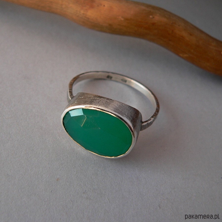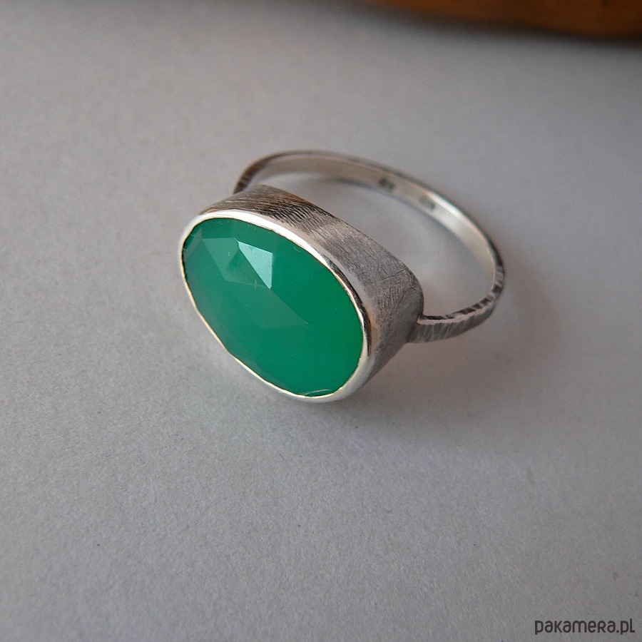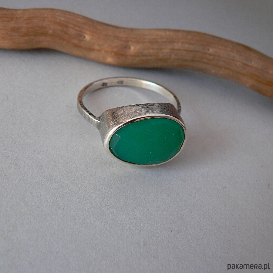 Minimalistyczny pierścionek wykonany ze srebra i owalnego, fasetowanego zielonego onyksu. Wymiary kamienia 16/12 mm, oprawa kamienia profilowana dzięki temu pierścionek ładnie leży na palcu. Srebro fakturowane, oksydowane i polerowane. Rozmiar 28 Możliwość wykonania pierścionka z kamieniem osadzonym pionowo.