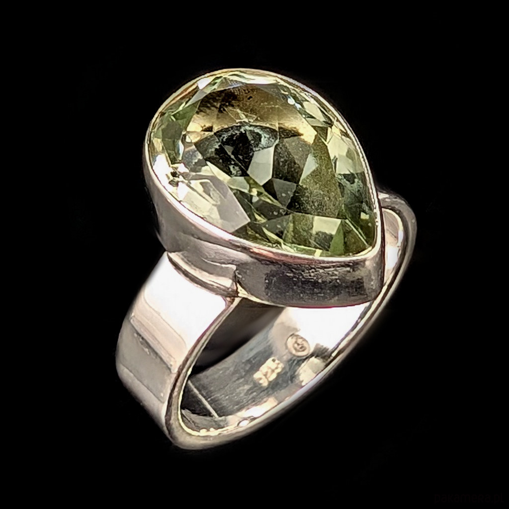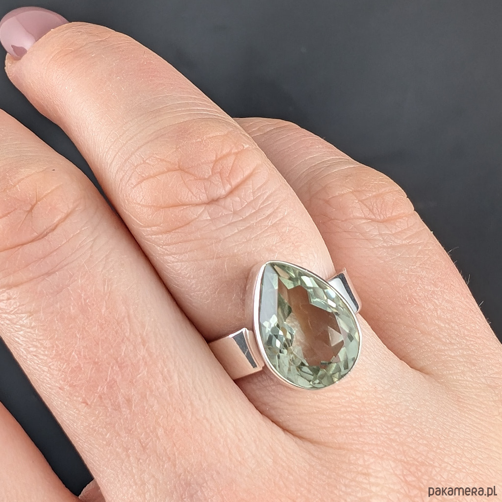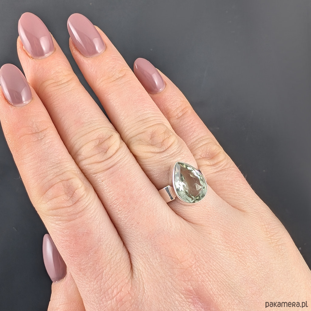 Pierścień wykonany ze srebra próby 925 oraz zielonego kryształu ametystu o precyzyjnym, pieknym szlifie. Przepiękny okaz. Wymiary oprawy kamienia 15 x 11 mm. Rozmiar jubilerski 13,mogę powiększyć na max 14. Waga 5,7 g. Wykonany przez dostawcę kamieni. Pierścień zostanie wysłany w ozdobnym pudełeczku.