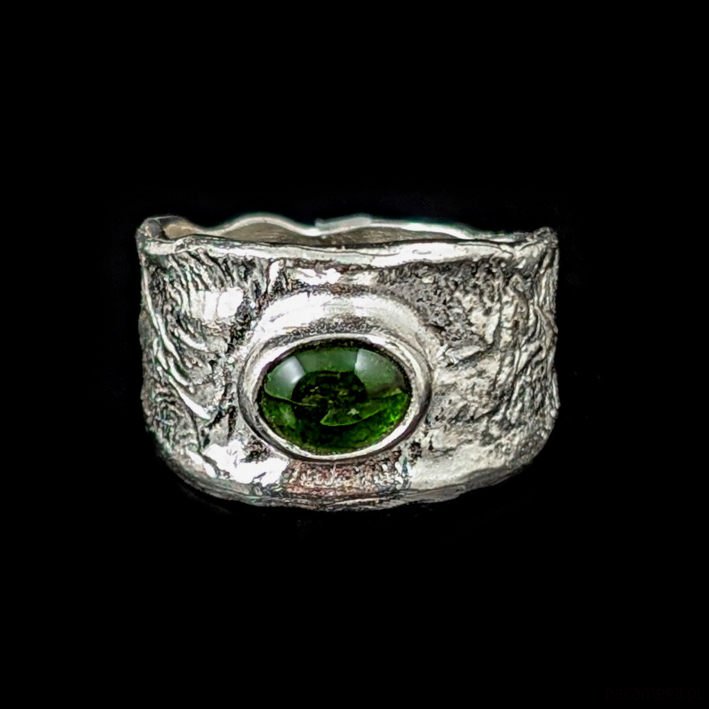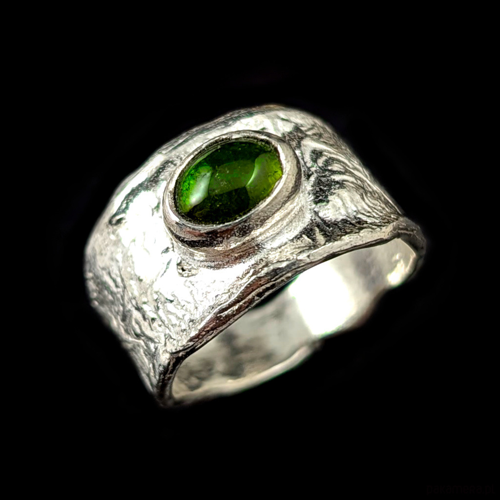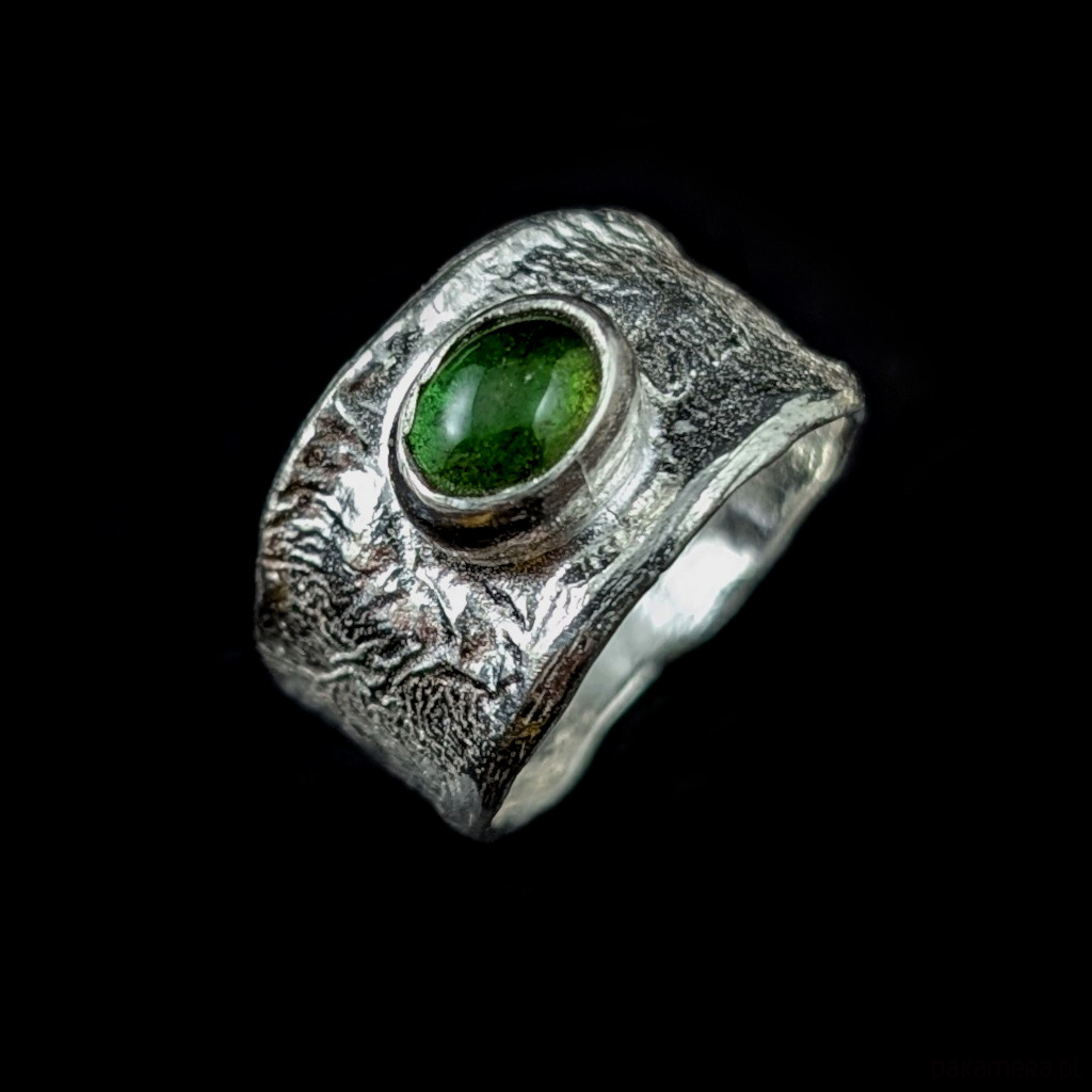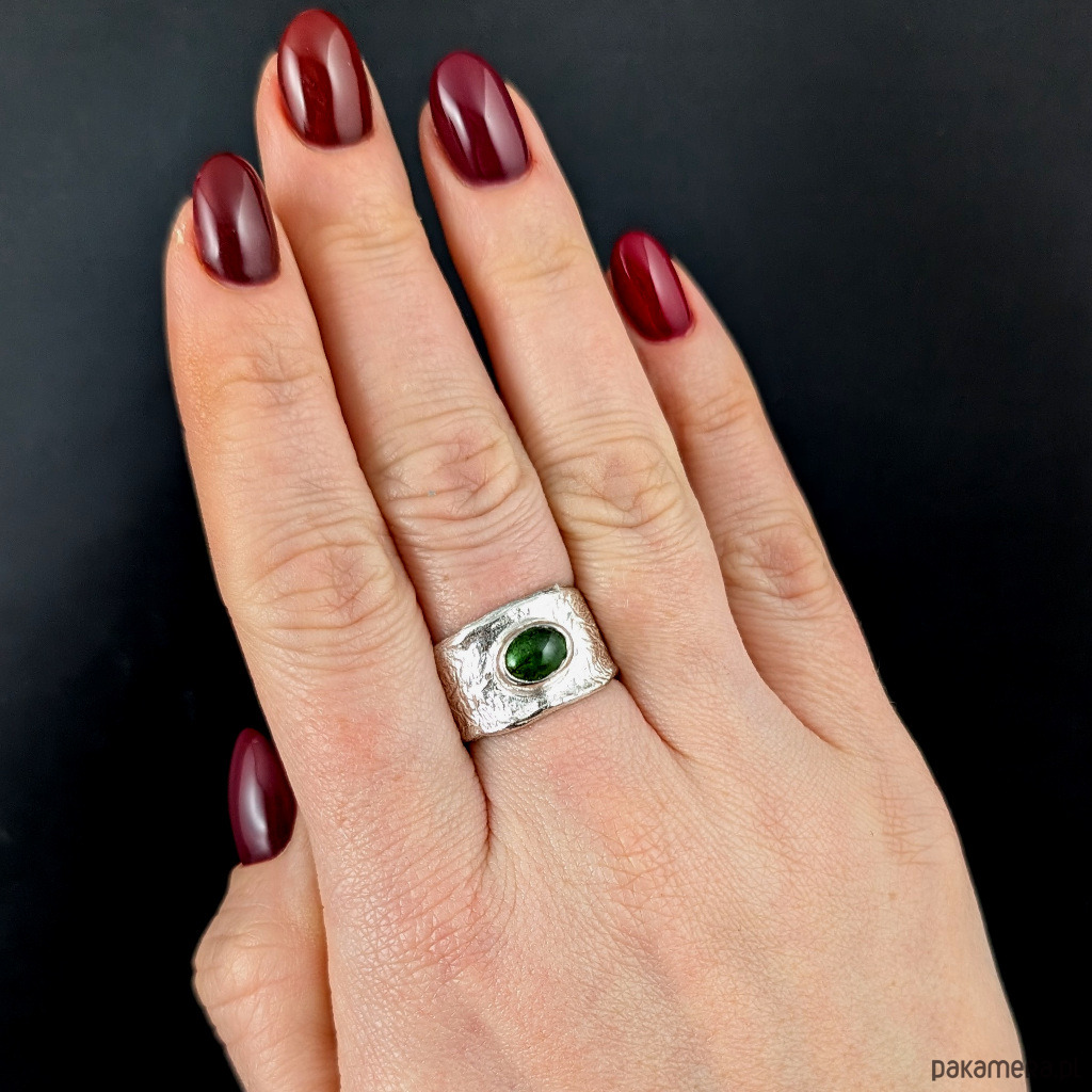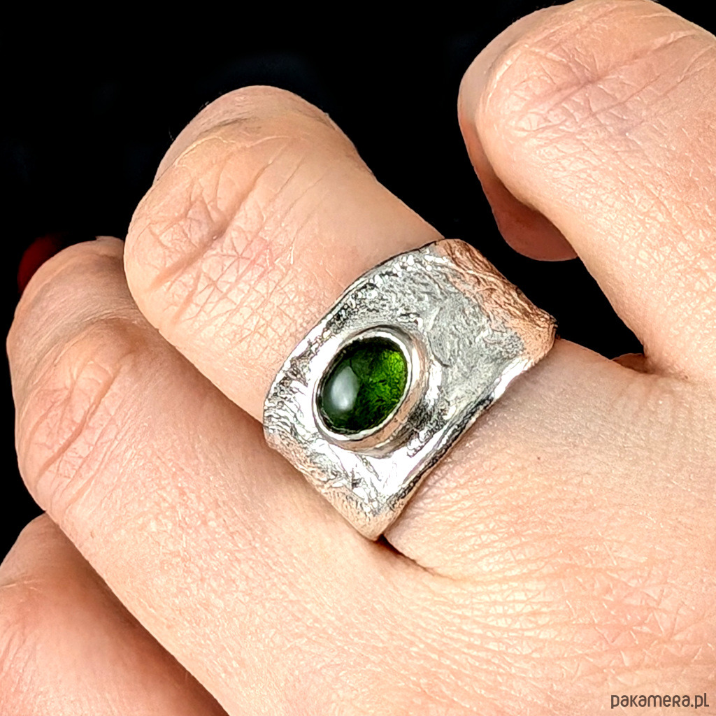Oryginalny pierścionek w sygnetowej formie wykonany ze srebra próby 925 oraz npęknego turmalinu w nasyconej zieleni. Wymiary oprawy kamienia 9x 7 mm. Wysokość obrączki max. 14 mm. Pierścień będzie pasował na rozmiar jubilerski 16, nie ma opcji zmiany rozmiaru. Waga 4,77 grama. Pierścionek zostanie zapakowany w ozdobne pudełeczko
