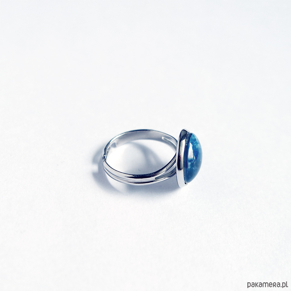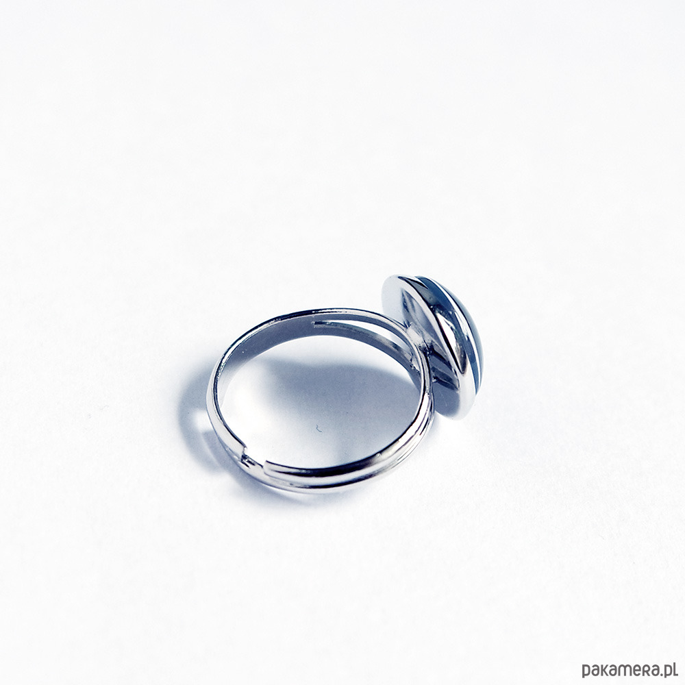 Grafika ukryta w prostym, eterycznym pierścionku, pod osłoną przeźroczystego półokrągłego szkiełka.