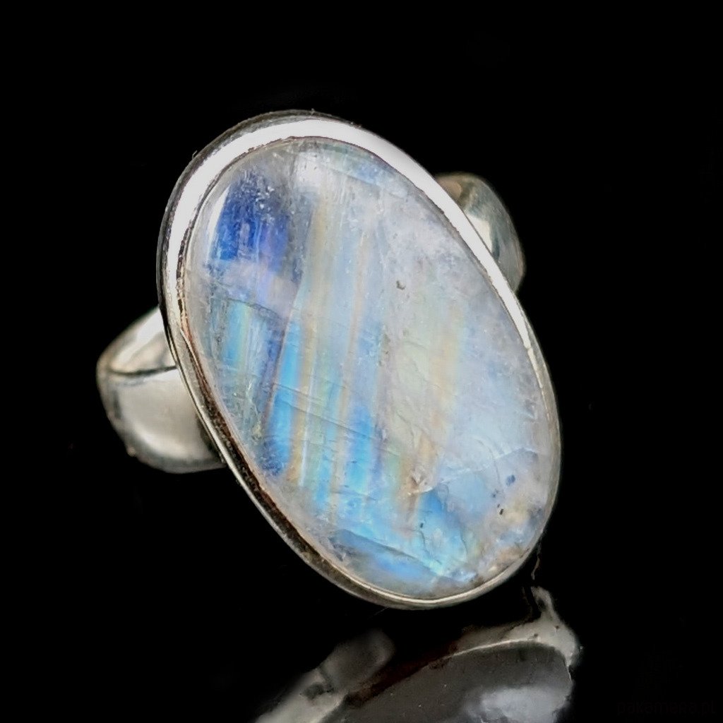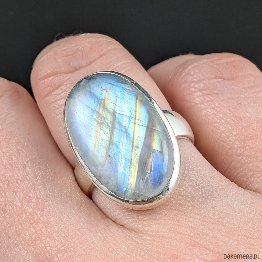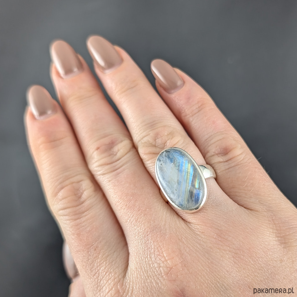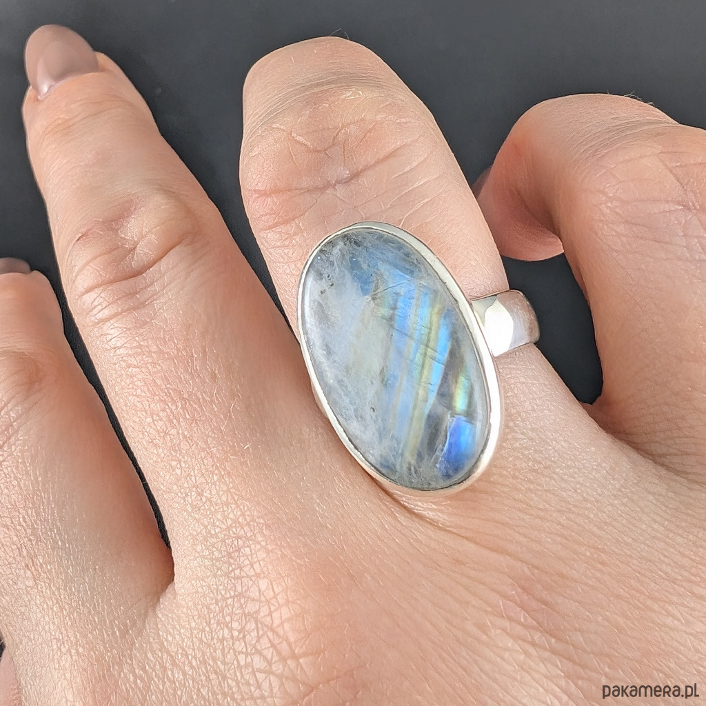 Pierścień wykonany ze srebra próby 925. Rozmiar jubilerski pierścionka 15 mogę powiększyć na max 16. Ozdobą pierścionka jest kamień księżycowy o pięknej błękitnej adularyzacji ze złocistymi refleksami. Wymiary oprawy kamienia 23 x 14 mm, szerokość obrączki max 4 mm i jest zwężana. Waga 8 g. Polecam, kamień jest piękny. Wykonany przez dostawcę kamieni. Pierścień zostanie zapakowany w ozdobne pudełeczko.