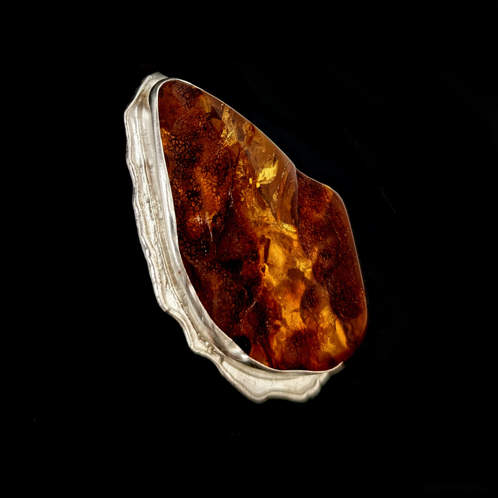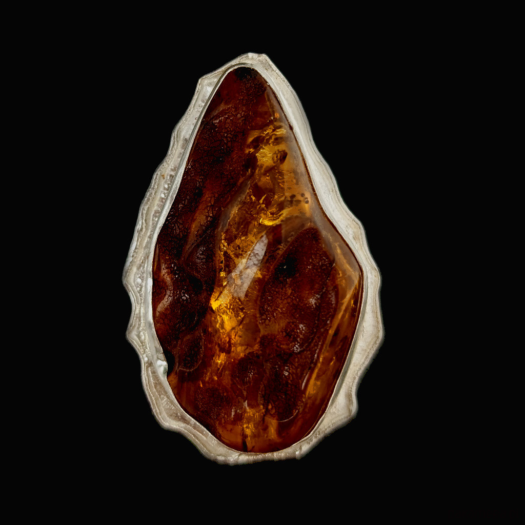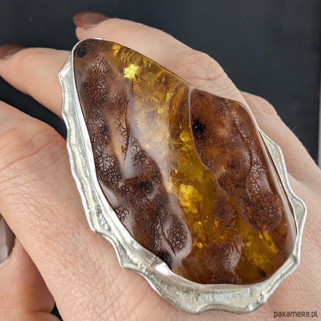 Bardzo okazały pierścień wykonany ze srebra pr. 925 oraz naturalnego bursztynu o barwie złocistego miodu. Rozmiar jubilerski 20, mogę powiększyć rozmiar pierścienia na max 23. Proszę napisać, jaki ustawić. Obrączka ma 5 mm szerokości. Wymiary 62 x 42 mm. Waga 28 g. Pierścień zostanie zapakowany w ozdobne pudełeczko.