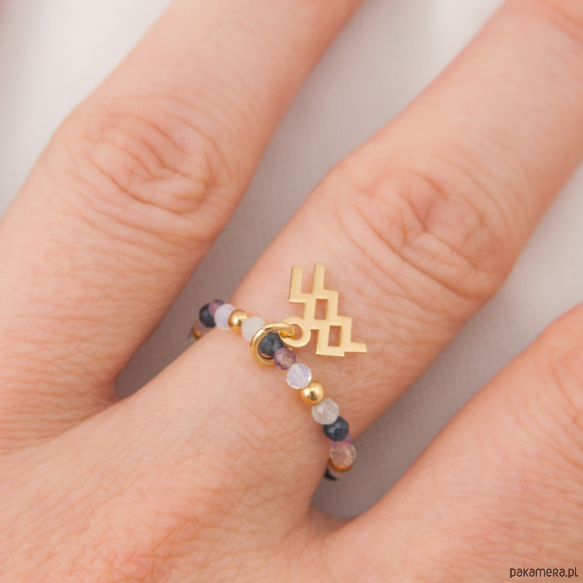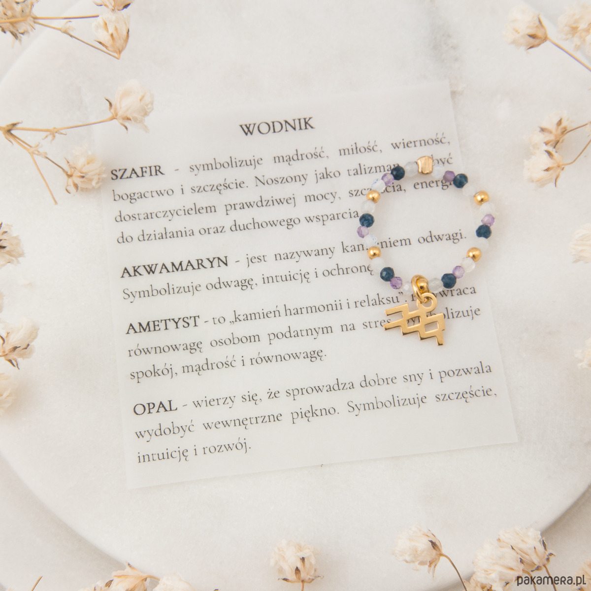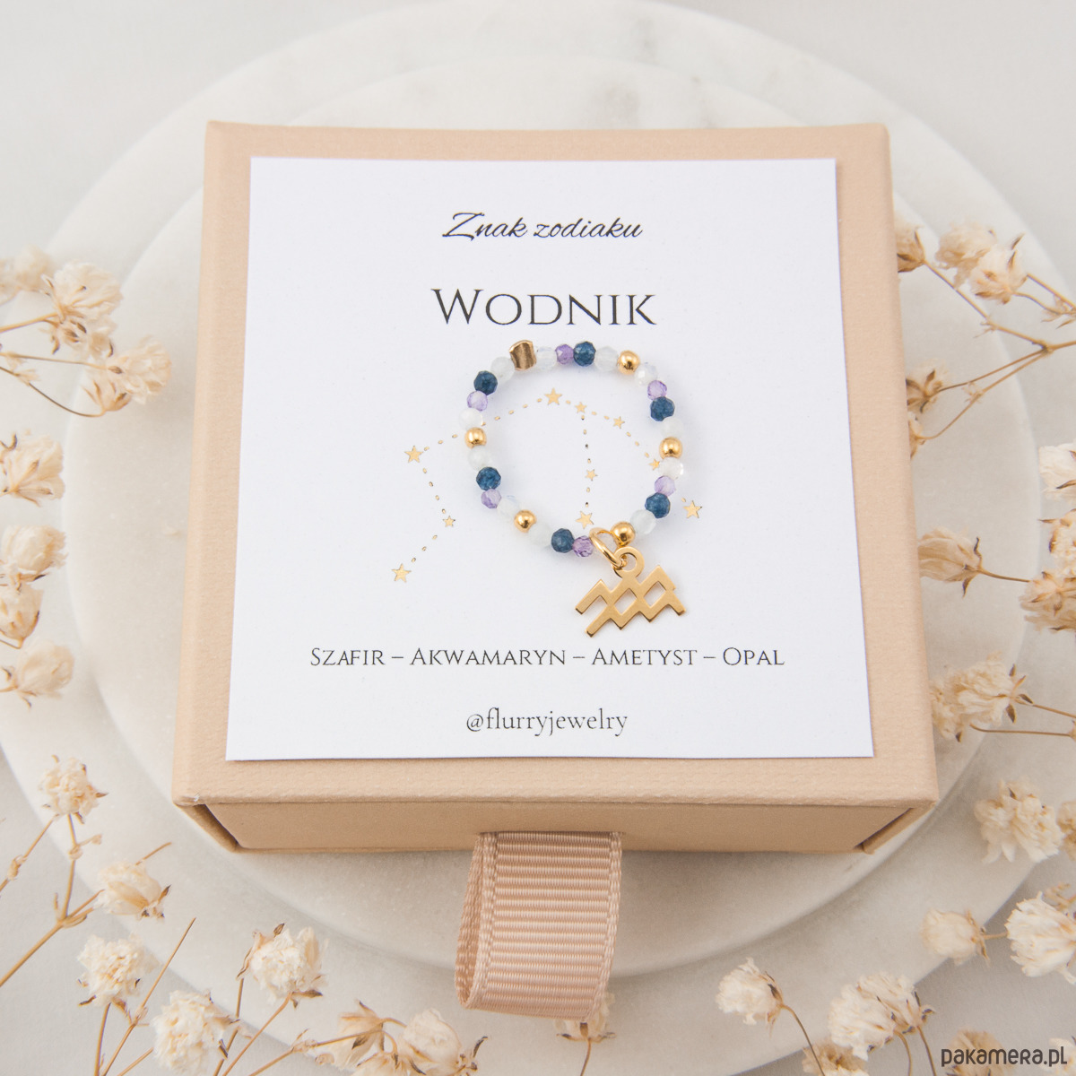 W astrologii wyróżniany 12 znaków zodiaku, które odpowiadają układom gwiazd na niebie w dniach urodzenia każdego z nas. Każdemu znakowi zodiaku przypisuje się specyficzne cechy charakteru, słabe i mocne strony, osobowość czy predyspozycje. Każdy ma swój szczęśliwy kamień i kolor. Biżuteria ze znakiem zodiaku to idealny prezent dla bliskiej Ci osoby, przyniesie szczęścia i ochronę na co dzień. Pierścionek ma dołączone kamienie zodiakalne dla wodnika.