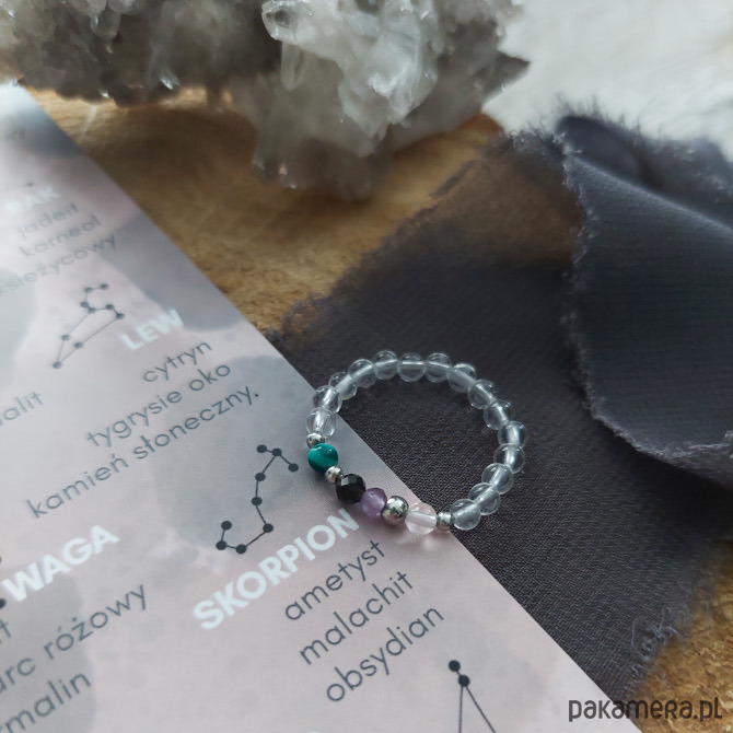 Delikatny, elastyczny pierścionek skomponowany dla zodiakalnego Skorpiona. Znajdziesz w nim minerały, które w szczególny sposób sprzyjają osobom spod tego znaku zodiaku, takie jak ametyst, malachit czy obsydian. Te wyjątkowe kamienie osadzone zostały na obrączce z gładkich kryształów górskich, będących odmianą kwarcu o najsilniejszych właściwościach oczyszczających. Kamienie uzupełnione są ozdobnymi elementami ze stali szlachetnej. Zodiakalny pierścionek to świetny pomysł na prezent w postaci spersonalizowanego talizmanu.