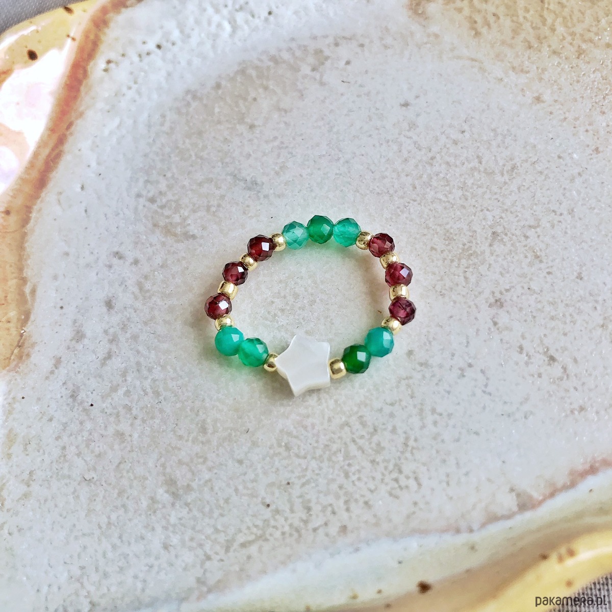 Pierścionek elastyczny z kamieni naturalnych granatów i zielonych onyksów 3 mm, przekładanych złotymi koralikami szklanymi Toho. Zwieńczenie stanowi urocza gwiazdka z masy perłowej.