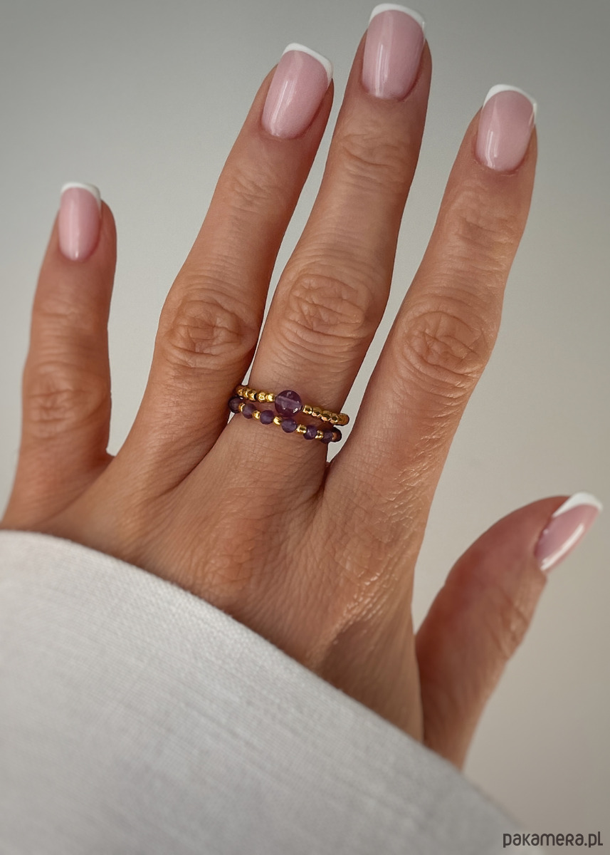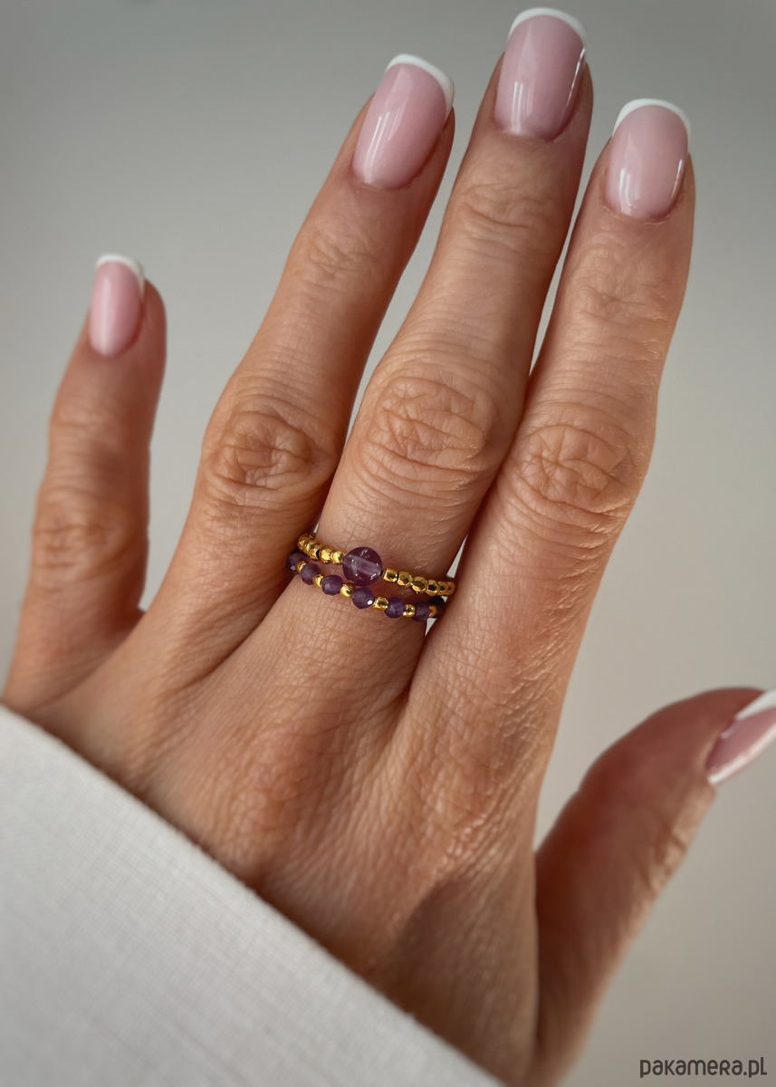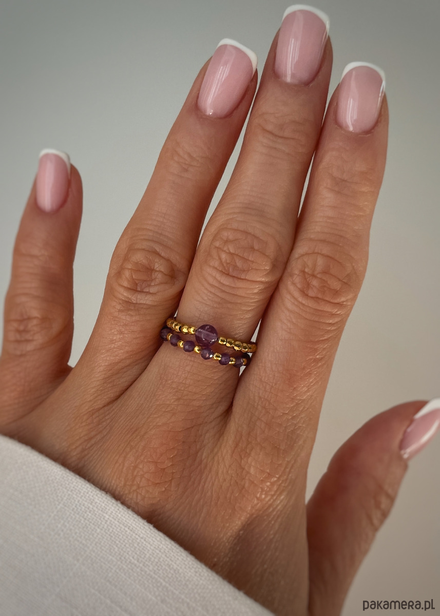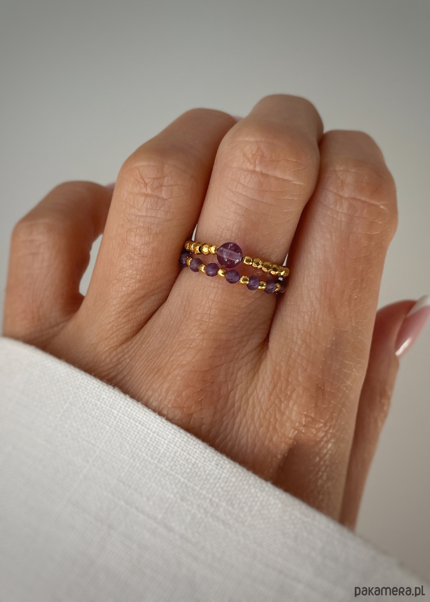 Ten zestaw dwóch elastycznych pierścionków to urzekające połączenie subtelności i elegancji. Pierwszy z nich, pełen spokojnej energii, wykonany jest z drobnych, fasetowanych kamieni ametystu (2mm), przeplatanych lśniącymi, pozłacanymi kuleczkami (1,8mm). Drugi natomiast przyciąga wzrok chłodnym blaskiem fasetowanego hematytu (2mm), z centralnym, większym oczkiem w postaci kulki ametystu (4mm), co tworzy niezwykle harmonijny i stylowy duet.