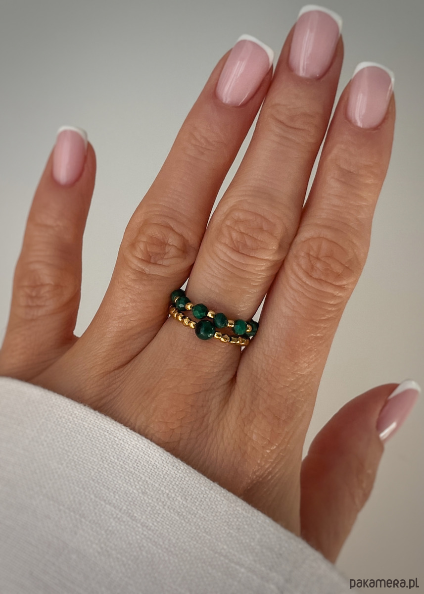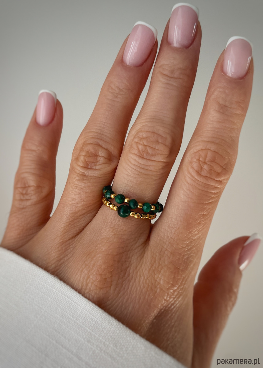 Ten zestaw dwóch elastycznych pierścionków to urzekające połączenie witalności i subtelnego blasku. Pierwszy z nich, pełen głębokiej zieleni, wykonany jest z drobnych, fasetowanych kamieni malachitu (3mm), przeplatanych lśniącymi, pozłacanymi kuleczkami (1,8mm). Drugi natomiast przyciąga wzrok ciepłym blaskiem fasetowanego hematytu (2mm), z centralnym, większym oczkiem w postaci kulki malachitu (4mm), tworząc niezwykle harmonijny i stylowy duet.