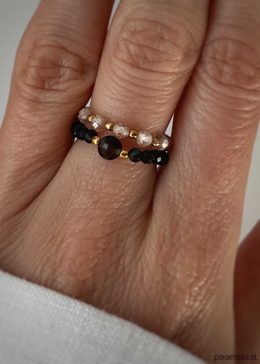 Ten zestaw dwóch elastycznych pierścionków to urzekające połączenie światła i głębi. Pierwszy pierścionek zachwyca lśniącymi, fasetowanymi cyrkoniami szampańskimi (3mm), przeplatanymi subtelnie pozłacanymi kuleczkami (2mm), które nadają mu elegancki blask. Drugi natomiast przyciąga wzrok intensywną czernią fasetowanego obsydianu (2mm), z centralnym, większym dyskiem obsydianu (4mm), co w połączeniu z pozłacanymi kuleczkami tworzy niezwykle stylowy i tajemniczy dodatek.