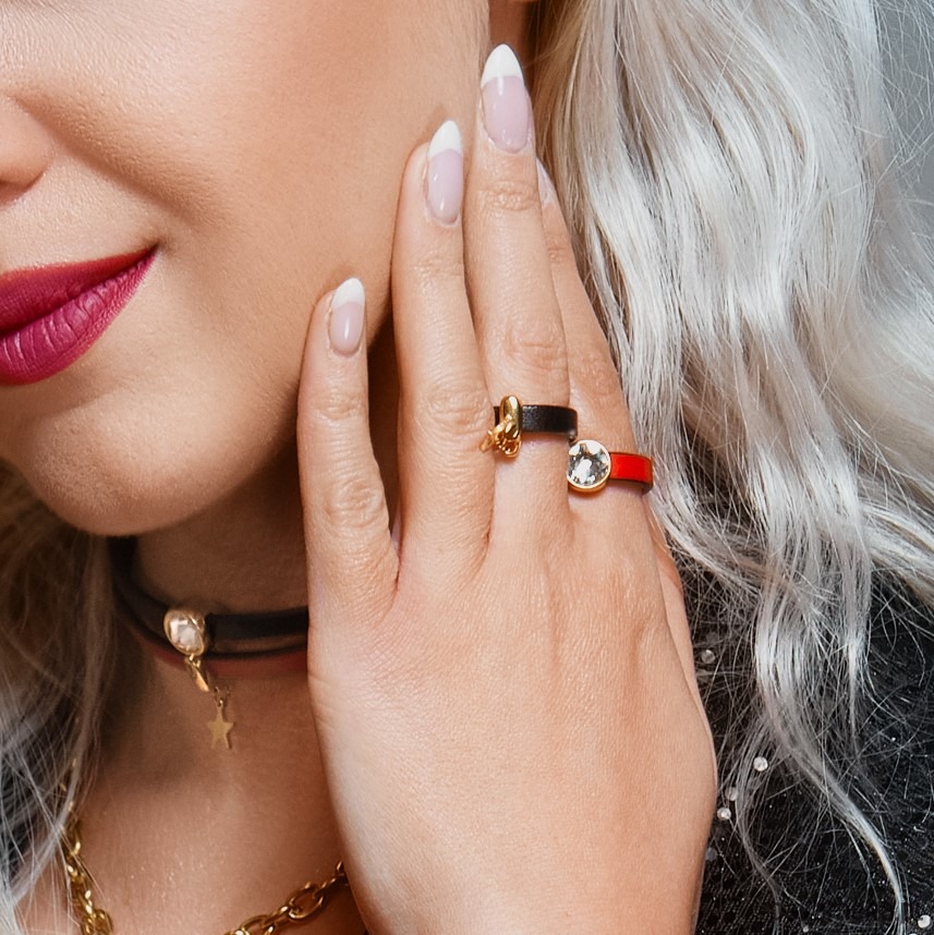 Pierścionek ze skóry naturalnej w kolorze czerwonym z połyskującym kryształem z złotej obwódce cynowej. Skóra naturalna pod wpływem noszenia staje się miękka i ładnie przylega do palca. Pierścionek cudnie prezentuje się palcu – niecodziennie i wyraziście.