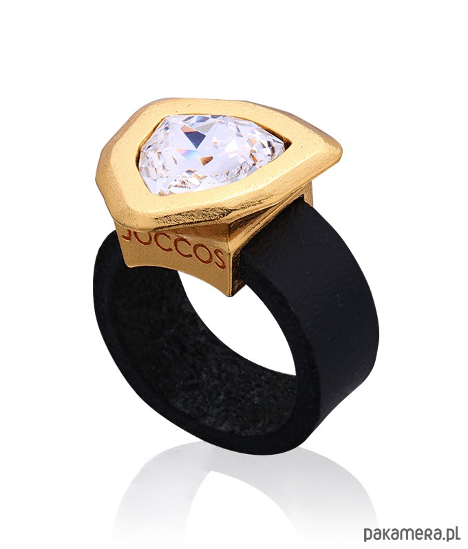 Pierścionek wykonany z ręcznie szlifowanego mosiądzu pozłoconego 24 ct złotem oraz kryształu Swarovskiego Trilliant Fancy Stone w odcieniu Crystal w rozm. 12 mm. Złocenie zabezpieczone polimerem jubilerskim. Średnica pierścionka 20 mm. Szerokość paska skórzanego 9 mm. Pierścionek sygnowany nazwą i logo marki.