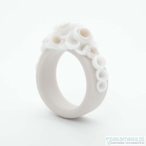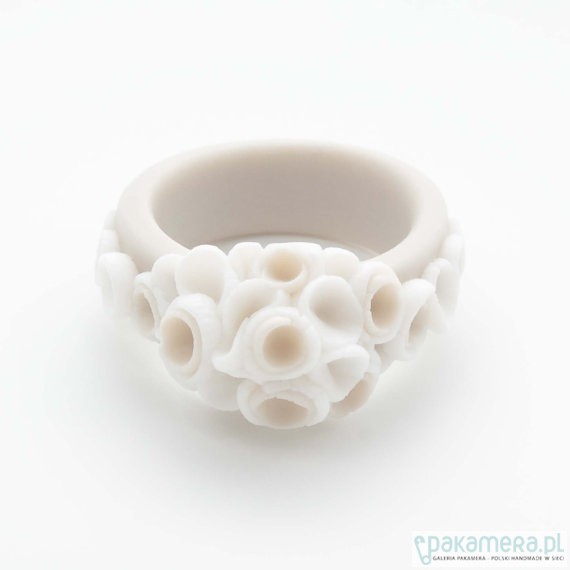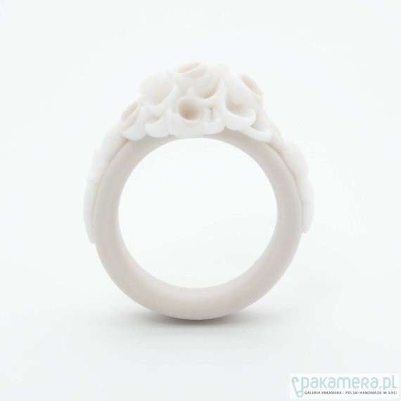 Ten uroczy pierścionek o delikatnych kwiecistych kształtach został wykonany z porcelany. Jest ona zabarwiona na ecru pięknie kontrastujac z nieskazitelną bielą. Produkt ten jest wypalony w wysokiej temperaturze co zapewnia jego trwałość. Materiał: Porcelana Nie szkliwiona Szerokość obrączki: 0,8 cm Kwiat : 1.7 x 1.7cm Dostępne rozmiary : Średnica: 16,6 mm Rozmiar 13, Średnica:17,3 mm Rozmiar 15, Średnica:18,33 Rozmiar 18, Każdy pierścionek jest ręcznie formowany i będzie się nieznacznie różnić w wyglądzie. Każdy pierścionek jest wykonywany na zamówienie a czas realizacji to 3-5 dni roboczych. Jeśli masz jakiekolwiek pytania dotyczące wyrobów, lub chciałbyś zamówić inny rozmiar proszę o kontakt.