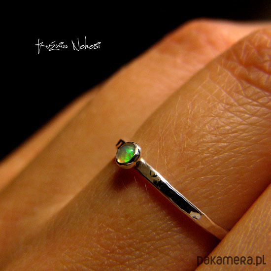 Delikatny pierścień ze srebra z Opalem Etiopskim. Obrączka młotkowana, polerowana na lustro. Rozmiar na zamówienie.