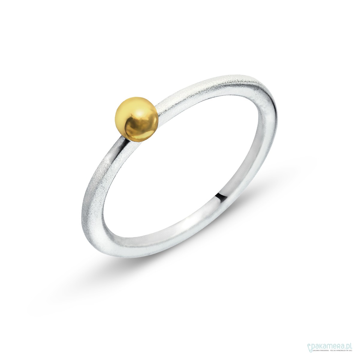 Srebrna (srebro 925) satynowana obrączka z kulką ze złota 585. Połączenie formy okręgu i kuli, wysmakowany minimalizm. Szerokość obrączki: 1,5 mm, wielkość kulki: 3mm