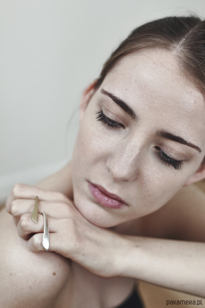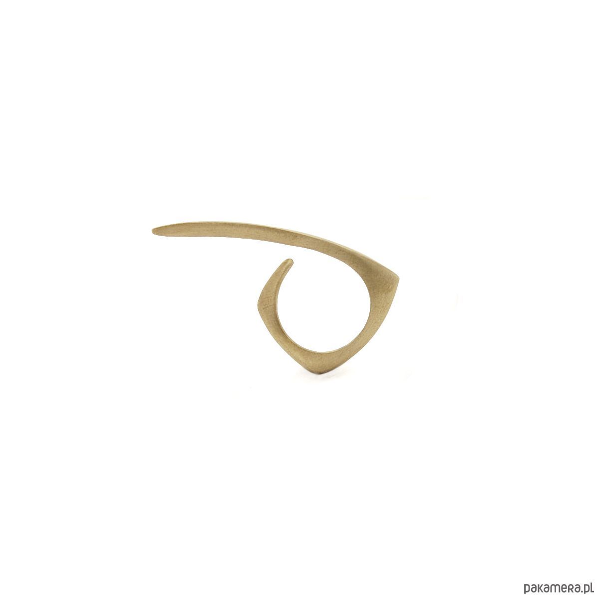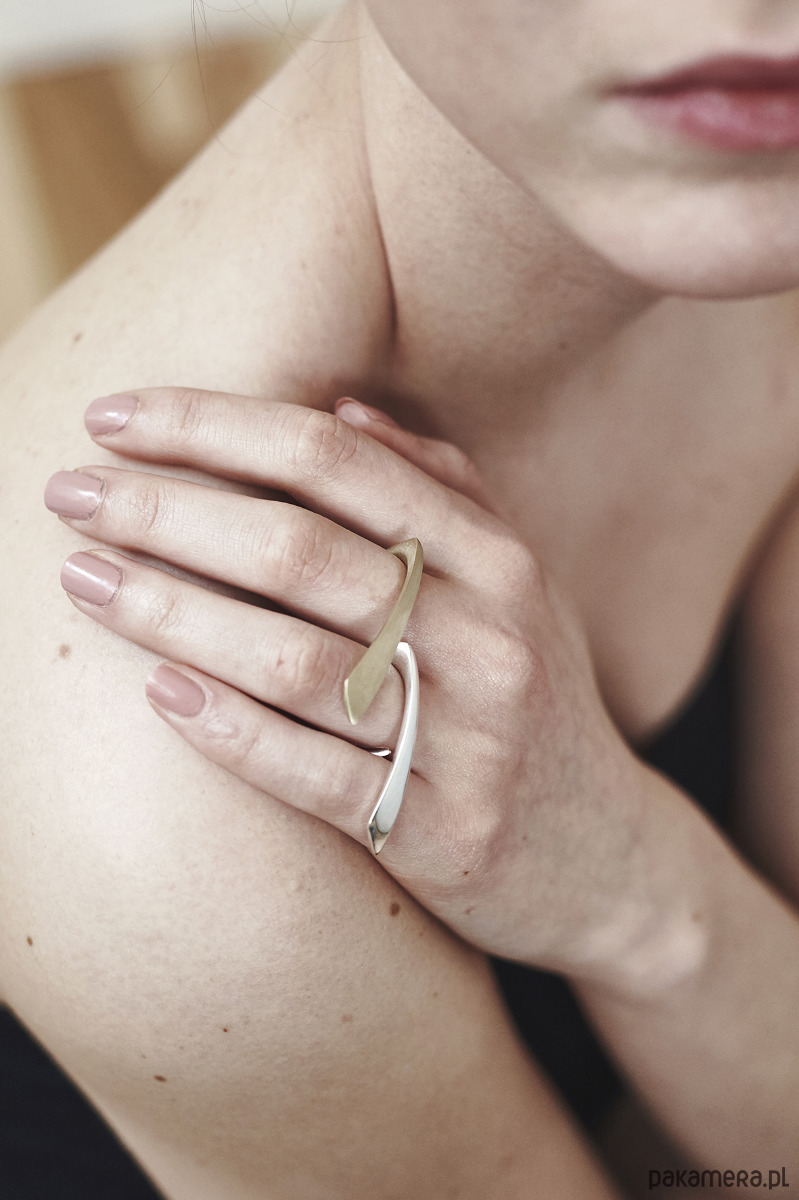 Intrygujący pierścionek wykonany z mosiądzu. Pierścionek ma nietypowy podłużny kształt i otwartą formę. Podłużny element układa się na sąsiednim palcu. Otwarta forma daje możliwość samodzielnej modyfikacji rozmiaru poprzez delikatne ściśnięcie lub rozszerzenie pierścionka, dzięki czemu można go zakładać na inne palce.