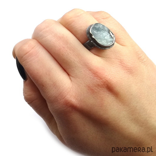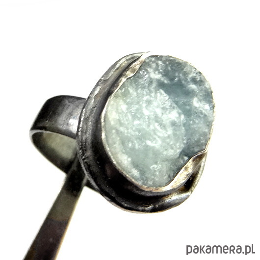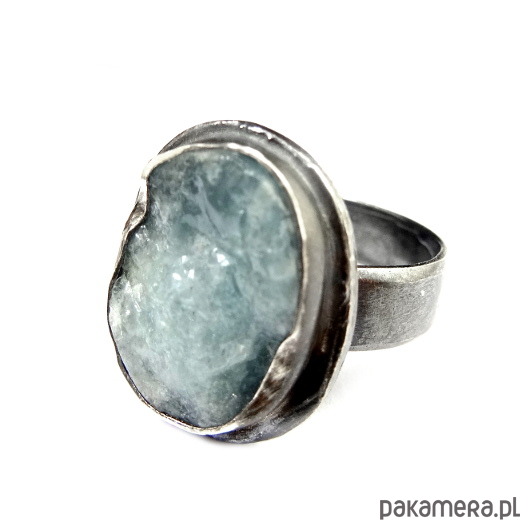 Pierścień z oprawionym ręcznie w srebro próby 925 naturalnym, surowym akwamarynem o przepięknej barwie wodnego błękitu .Wymiary całej oprawy 19 x 16 mm. Rozmiar jubilerski regulowany w szerokim zakresie, szeroka obrączka ma 6 mm.Waga pierścienia 7 gramów. Pierścień zostanie wysłany w ozdobnym pudełeczku.
