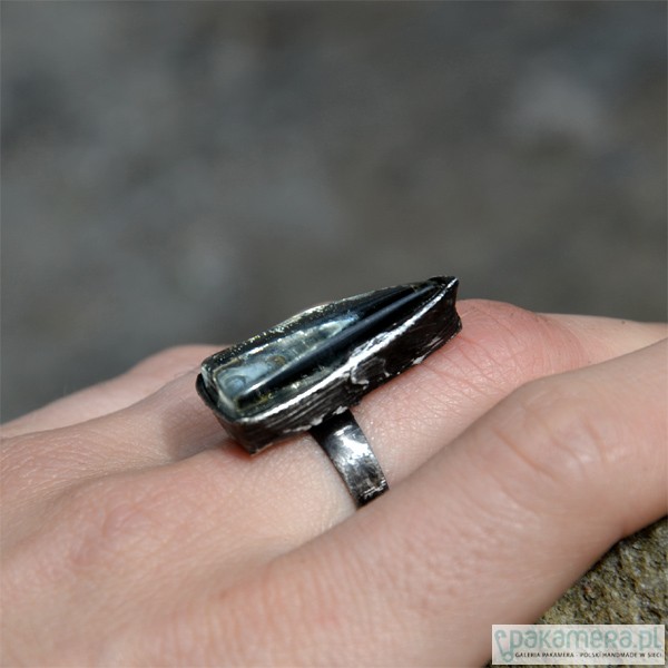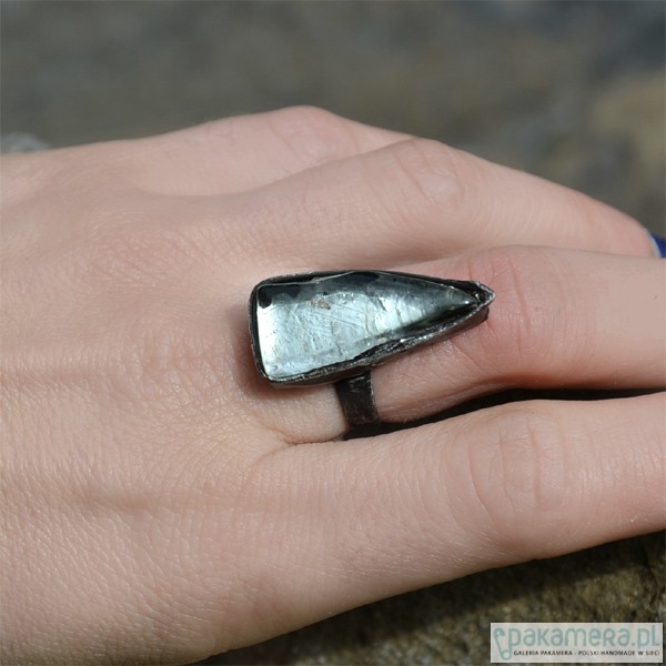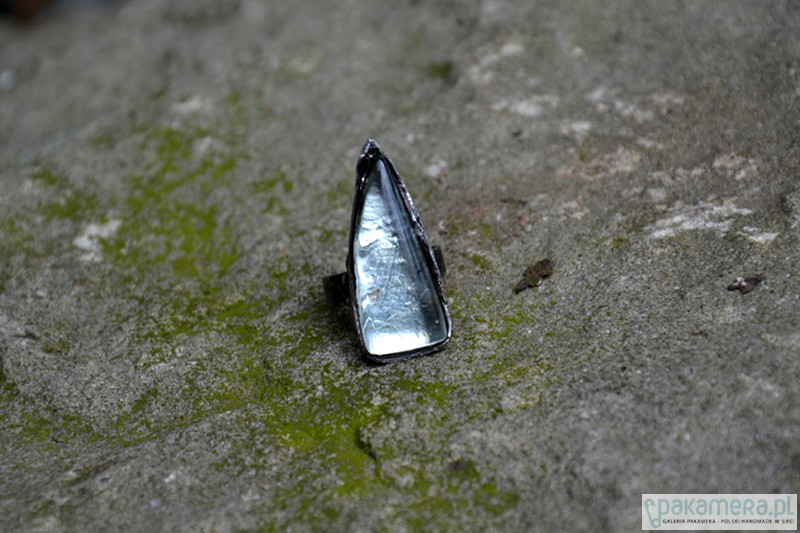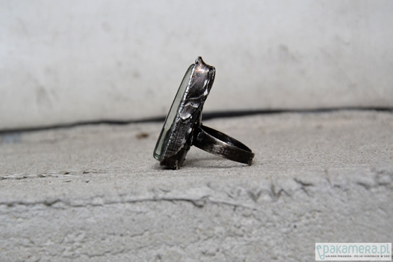 Bardzo efektowny pierścionek ze stapianym szkłem. Wymiary szkła wraz ze stylizowaną na stare srebro oprawą to ok. 3 x 1,5 cm. Obrączka regulowana. Biżuteria w 100% wykonana ręcznie, poszczególne sztuki mogą się minimalnie różnić.
