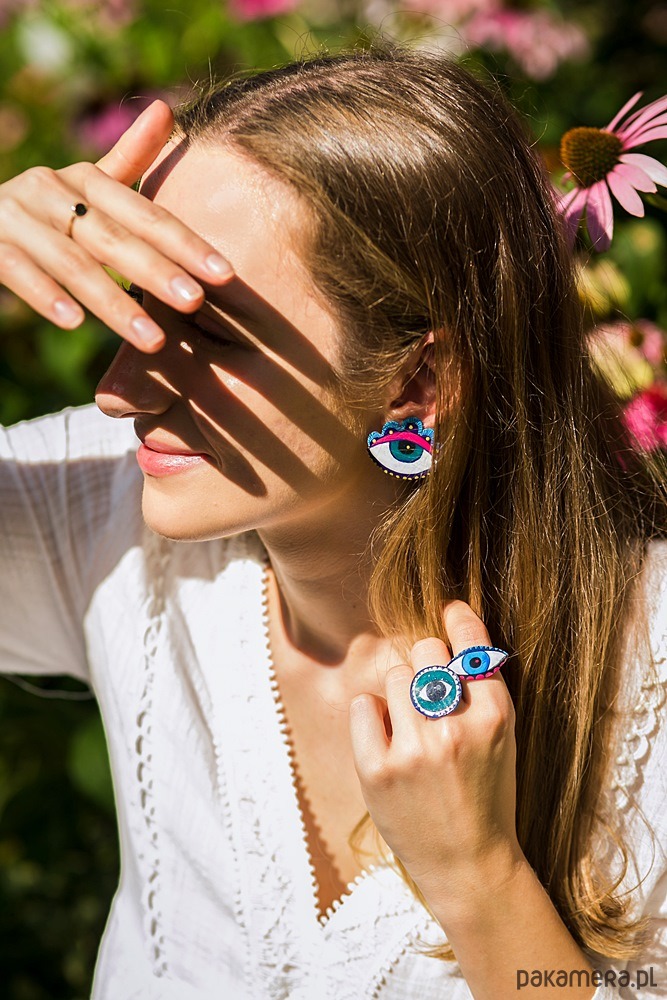 Pierścionki zostały zaprojektowane w formie uroczych „patrzących” oczu, które zdają się śledzić każdy ruch dłoni. Ich nietypowy wygląd sprawia, że są nie tylko ozdobą, ale także ciekawym elementem stylizacji i świetnym tematem do rozmów. Oczy mają wyraźne, kontrastowe detale, dzięki którym wyglądają bardzo wyraziście i przyciągają wzrok.