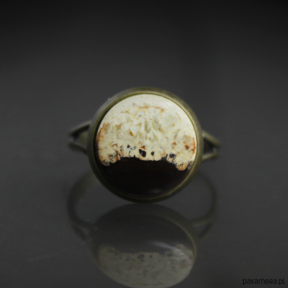 Efektowny pierścień z ceramicznym oczkiem, ręcznie wykonanym z gliny kamionkowej, poszkliwionym mieszanką brązowych i beżowych szkliw z efektem plamek. Obrączka regulowana w kolorze starego złota, średnica oczka ok 12mm. Polecam
