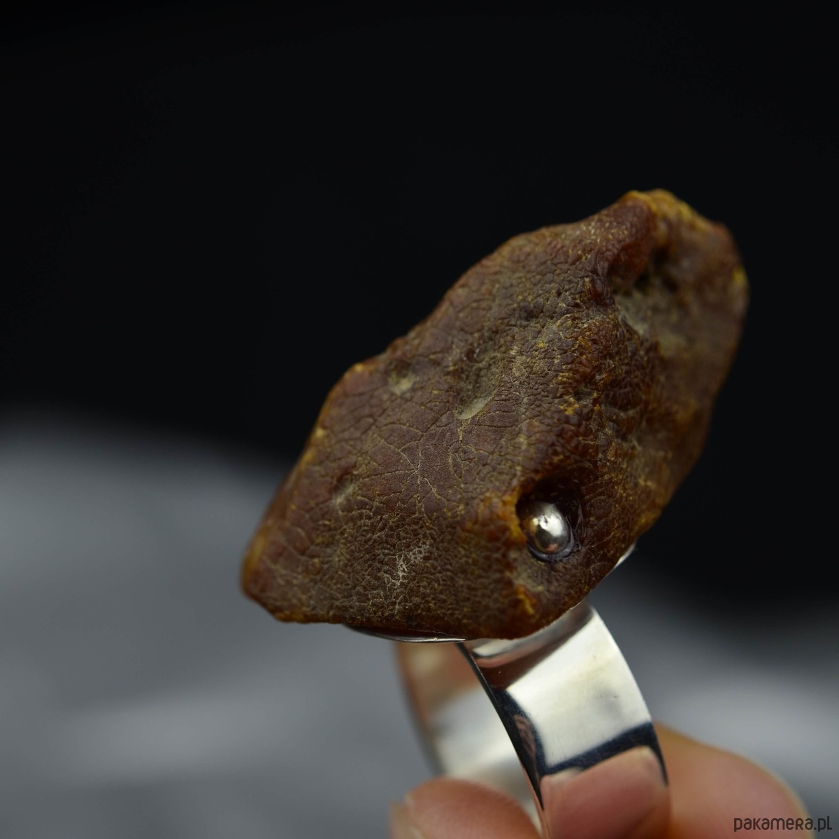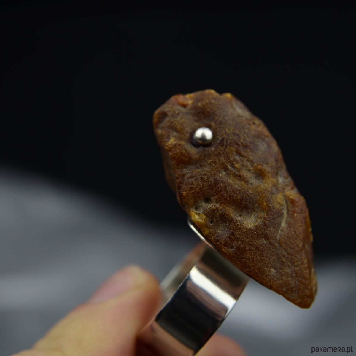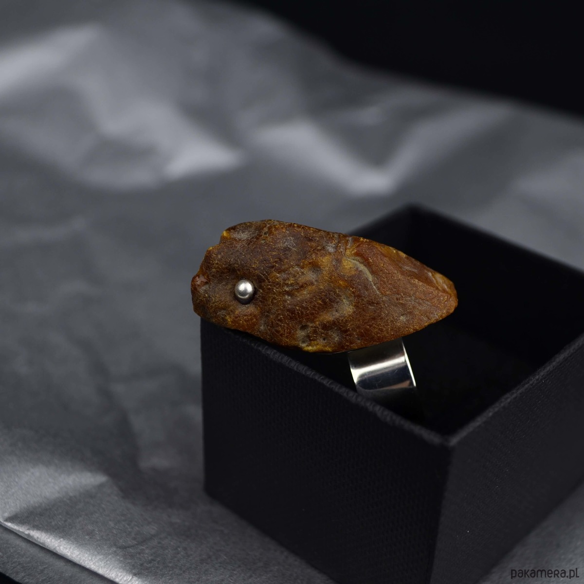 Oto pierścionek tylko dla odważnych! Duży surowy bursztyn bałtycki i srebro próby 925 połączyły swoje siły i wspólnie tworzą oryginalny masywny pierścionek. Bursztyn jest nieoszlifowany i w całości pokryty naturalną bursztynową korą, w jej zagłębieniach ukryłam dwie kulki ze srebra. Ten pierścionek powstał, by podbijać świat, wyróżnij się bursztynem!