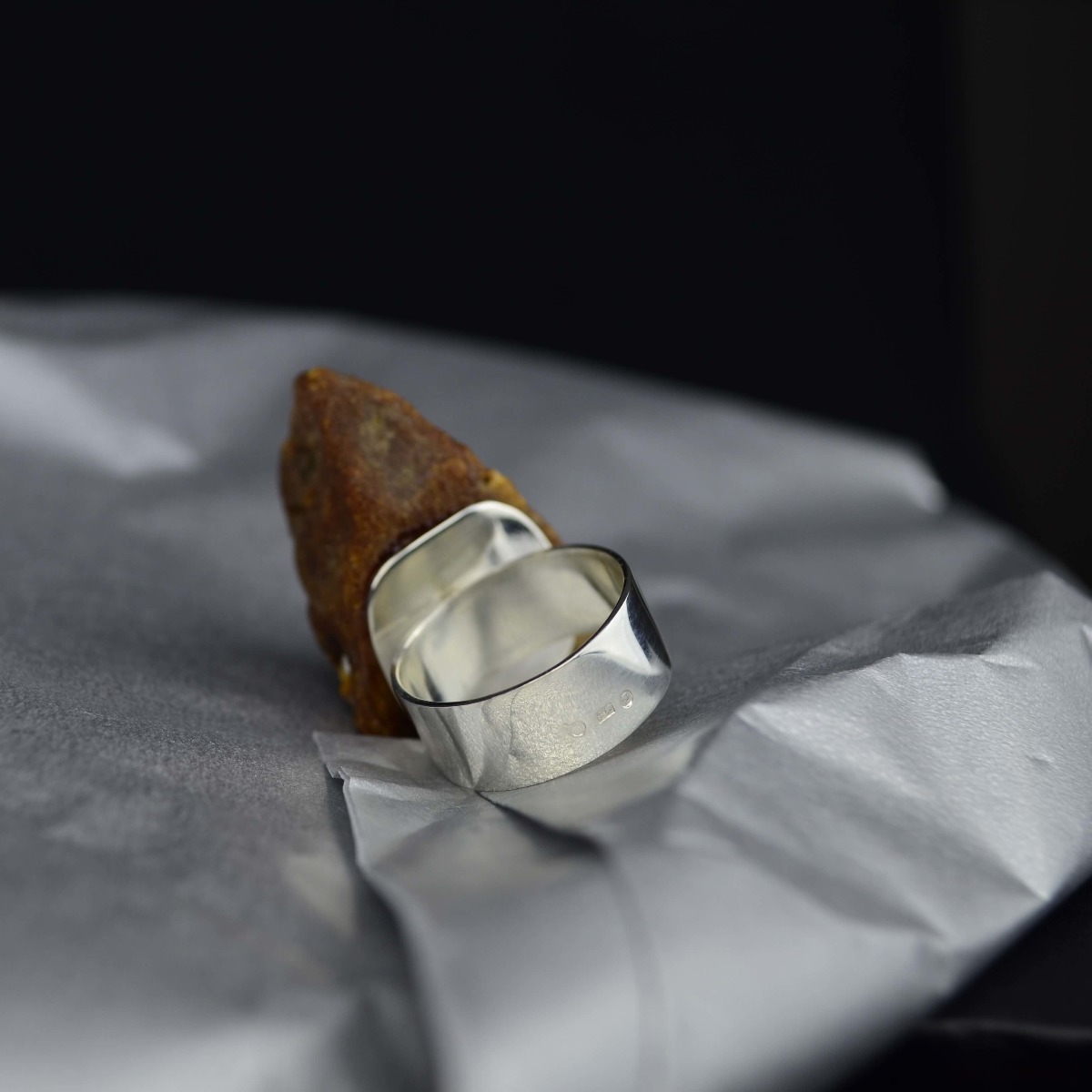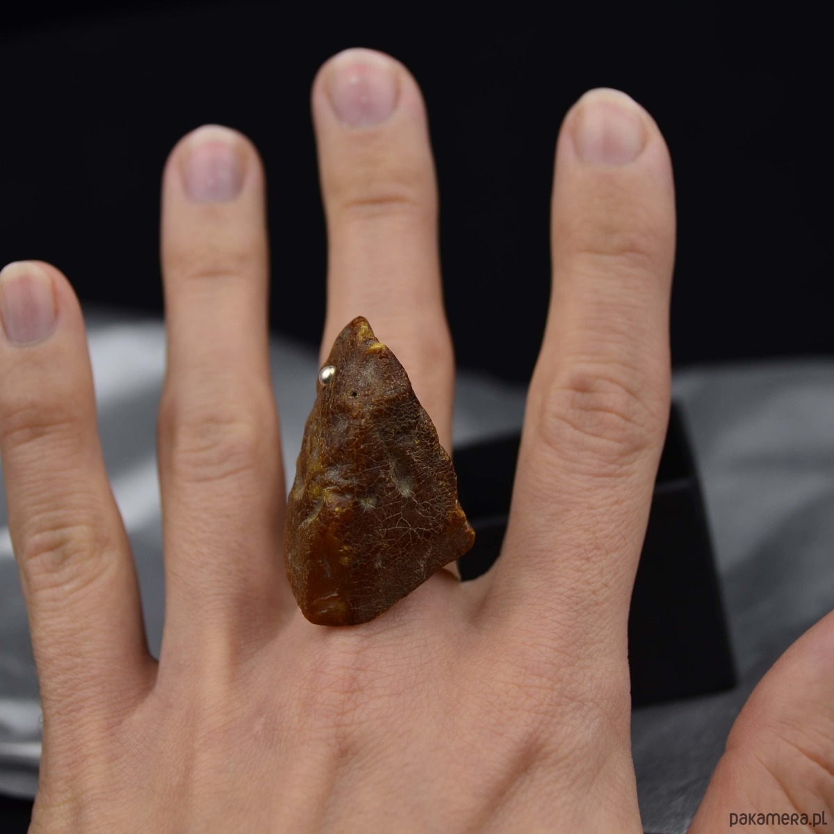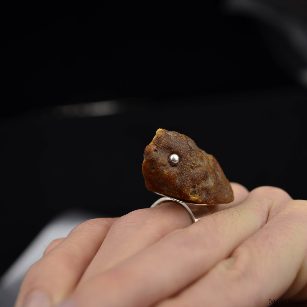 Oto pierścionek tylko dla odważnych! Duży surowy bursztyn bałtycki i srebro próby 925 połączyły swoje siły i wspólnie tworzą oryginalny masywny pierścionek. Bursztyn jest nieoszlifowany i w całości pokryty naturalną bursztynową korą, w jej zagłębieniach ukryłam dwie kulki ze srebra. Ten pierścionek powstał, by podbijać świat, wyróżnij się bursztynem!