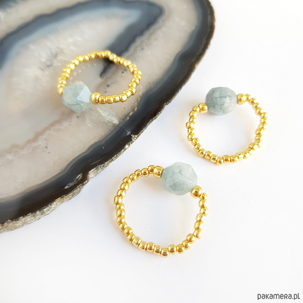 Pierścionek wykonany z kamienia naturalnego - jadeitu w formie bryłki, galwanizowanych na złoto szklanych kuleczek oraz elastycznej silikonowej gumki