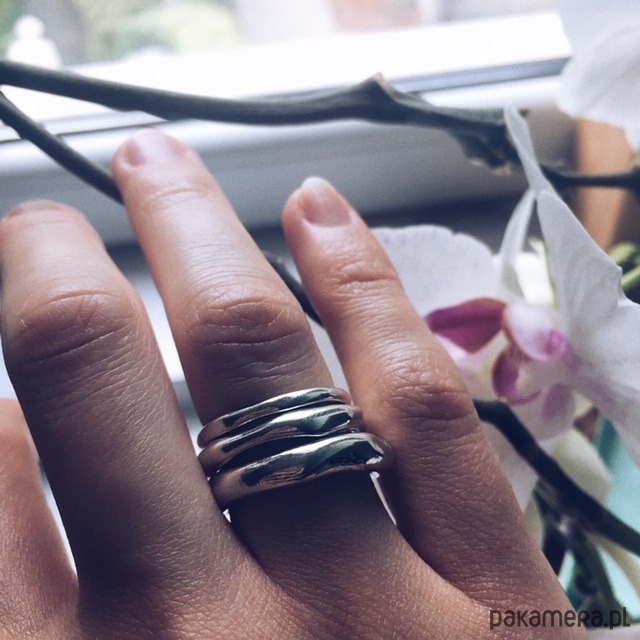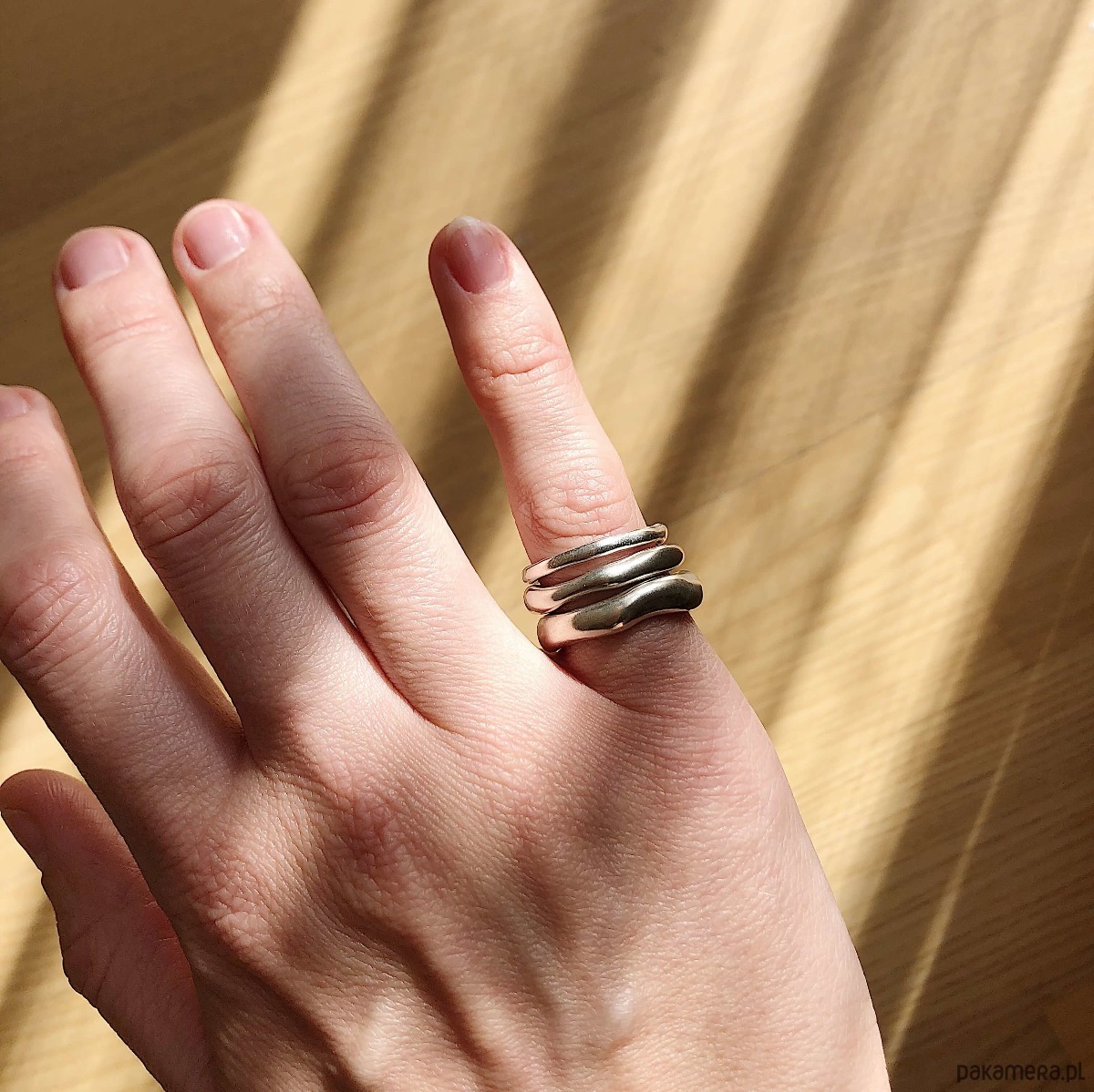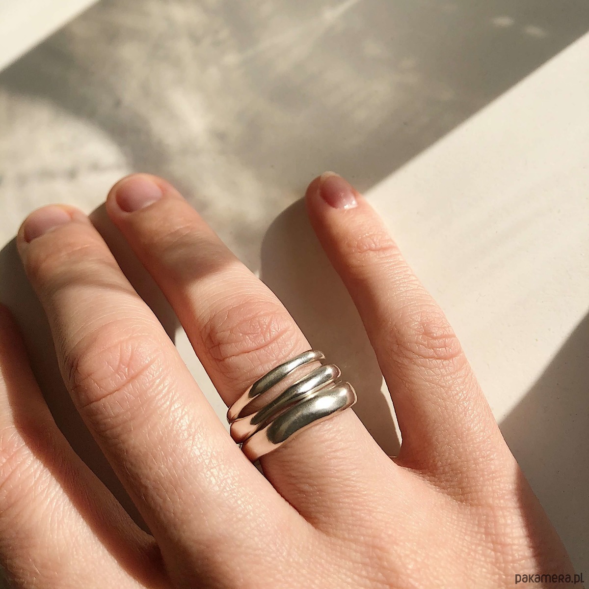Nieregularny pierścionek z kolekcji "Liquid", zainspirowany płynnym srebrem. Całość wykonana ze srebra próby 925. Wybierz odpowiedni rozmiar. Na zdjęciu porównanie pierścionków Liquid: Small, Medium, Big.