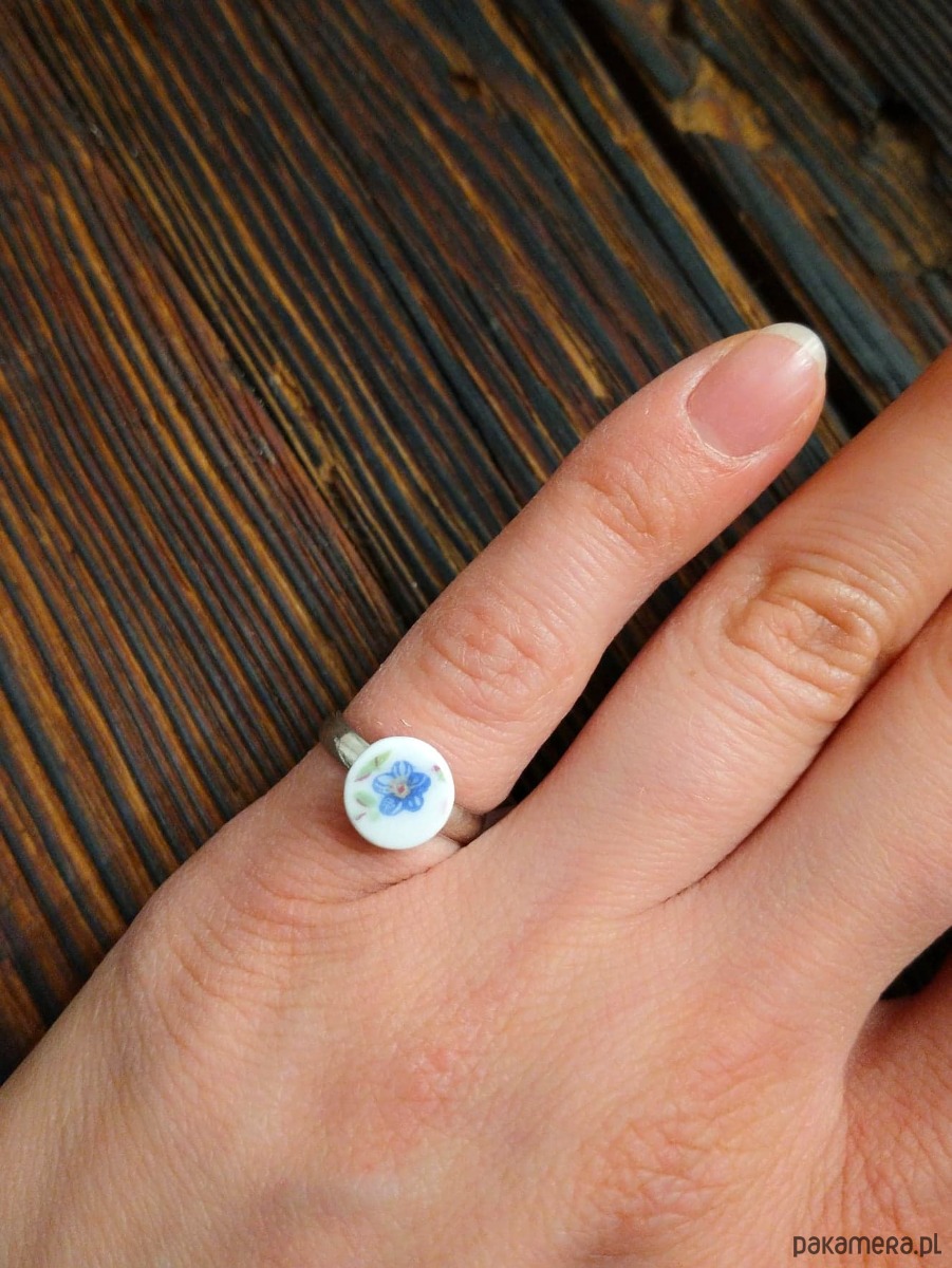 Pierścionek wykonany z użyciem fragmentu starej porcelany w kwiaty. Fragment został oszlifowany i połączony z metalową bazą pierścionka. Baza jest regulowana, natomiast jej wyjściowy rozmiar jest mniejszy niż standardowy - będzie pasował na bardzo drobną dłoń lub mały palec (rozmiar 7-9). Średnica elementu ceramicznego: 9 mm. Unikat - każdy wyrób biżuterii z talerzy występuje w jednym egzemplarzu.