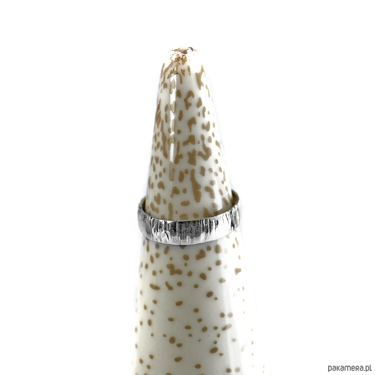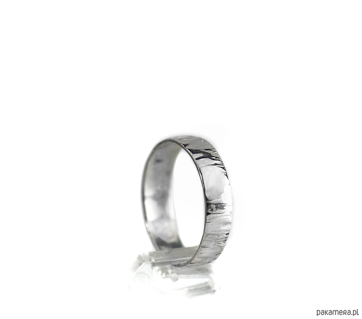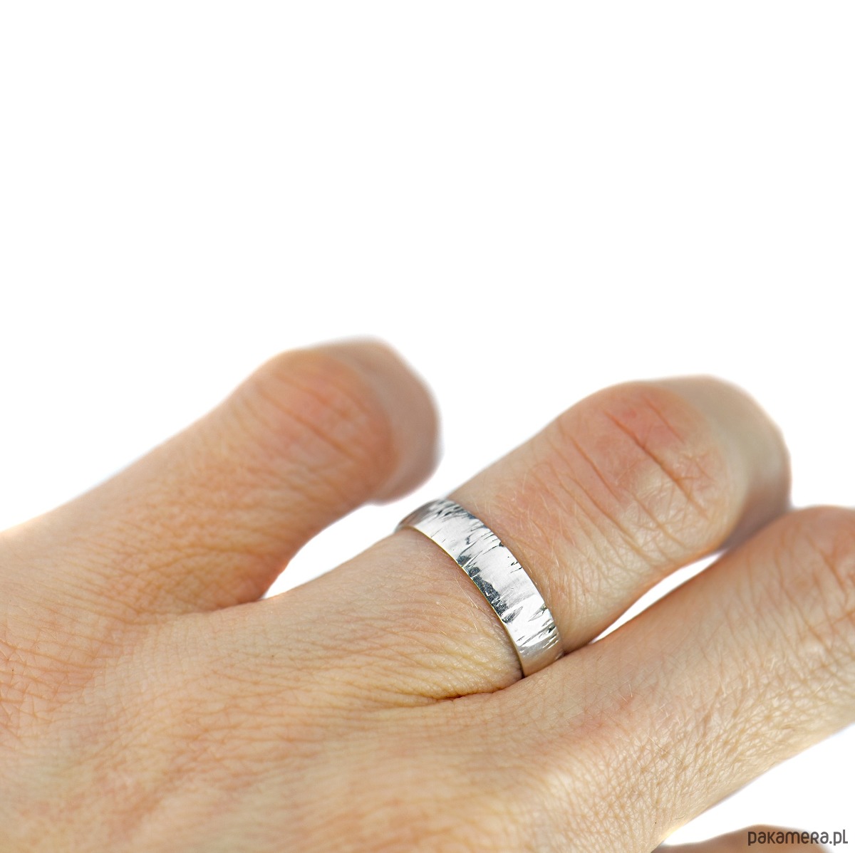 Pierścionek, lekko pękata obrączka średniej szerokości z młotkowaną powierzchnią. Wykonana od podstaw ręcznie ze srebra 925.