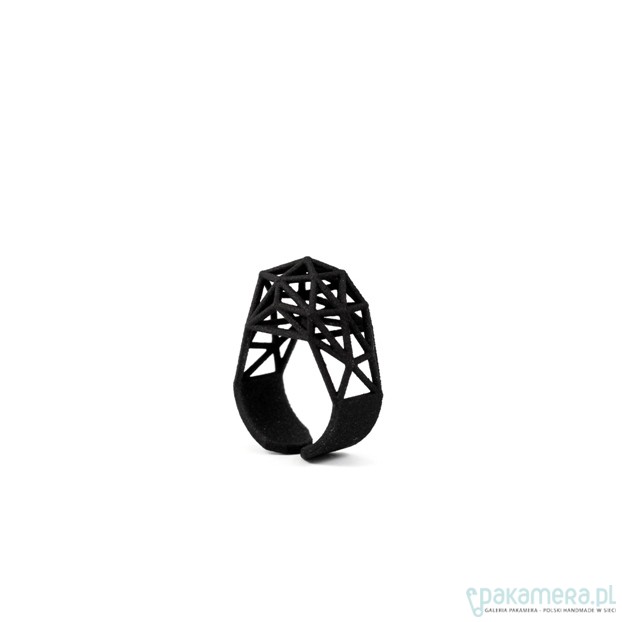 Pierścionek z kolekcji "New Geometry", wykonana w innowacyjnej technice druku 3D. Pierścionek wykonany z nylonu. Kolor czarny. Biżuteria jest bardzo lekka, nylon jest materiałem mocnym i elastycznym. Rozmiary (miara europejska) : s (13/14/15) , m (16/17) , l (18/19/20).