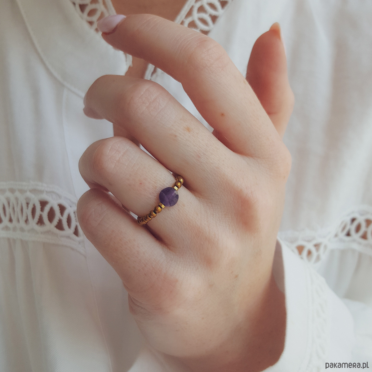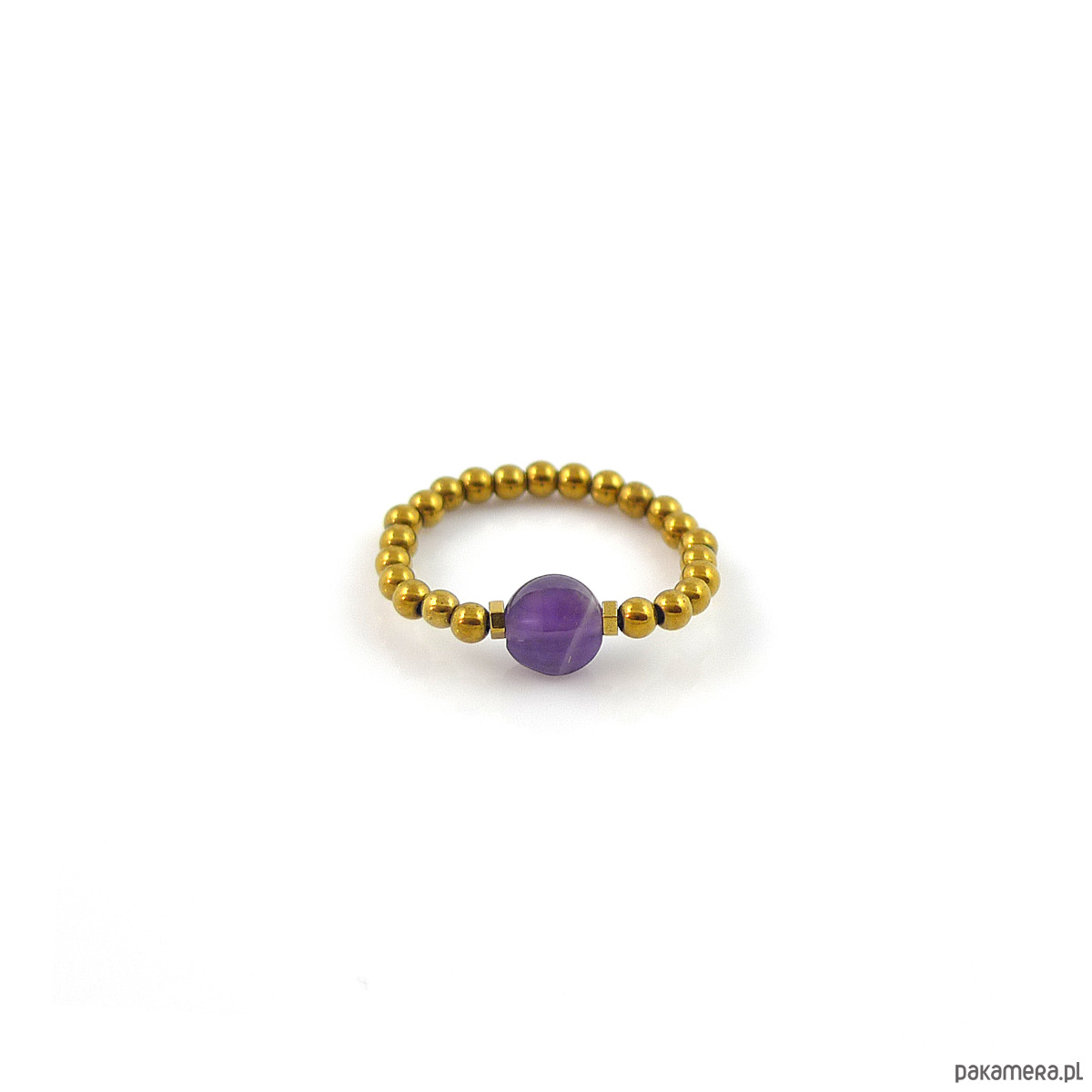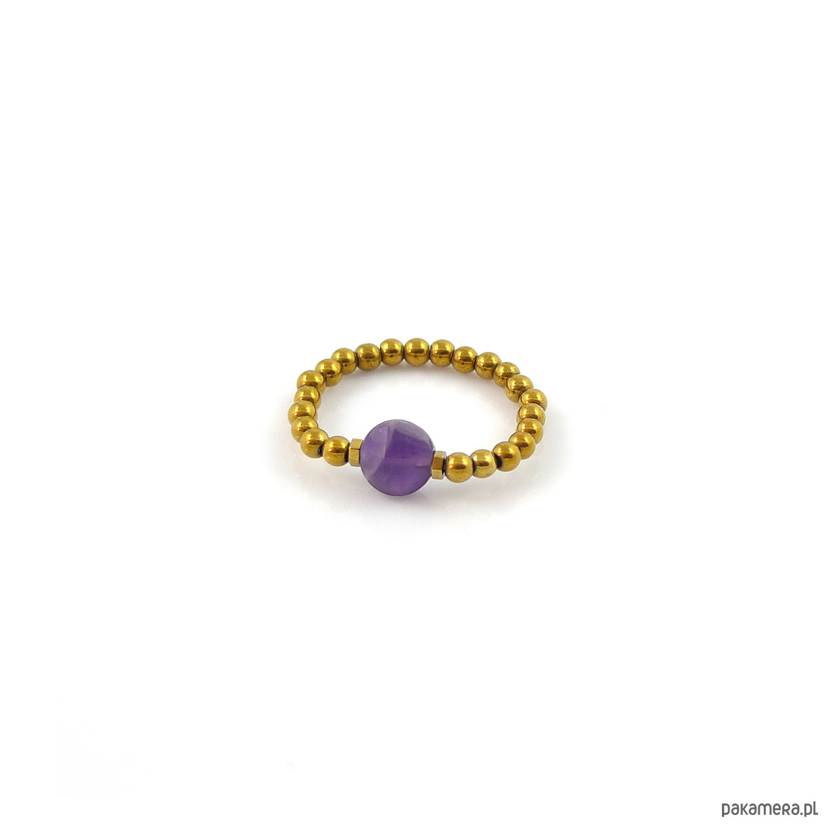 Pierścionek elastyczny wykonany z kamieni hematytu i oczka z ametystu. Obręcz pierścionka budują okrągłe hematyty w kolorze złotym. Element ozdobny to płaskie, fasetowane oczko z fioletowego ametystu. Każdy pierścionek jest niepowtarzalny ze względu na różne ametystowe oczka. Mogą być one całe fioletowe lub mieć jaśniejsze kremowe smugi albo wpadać w odcienie szarości – zawsze prezentują się wyjątkowo.