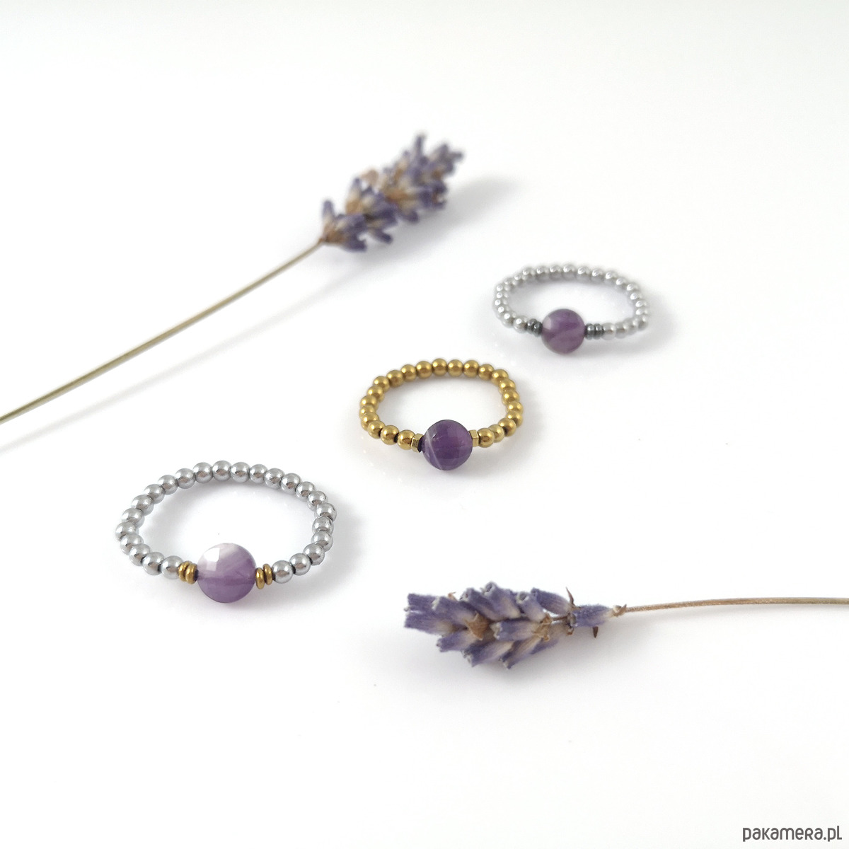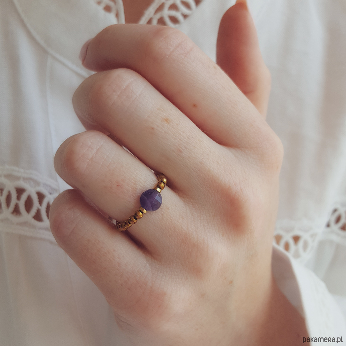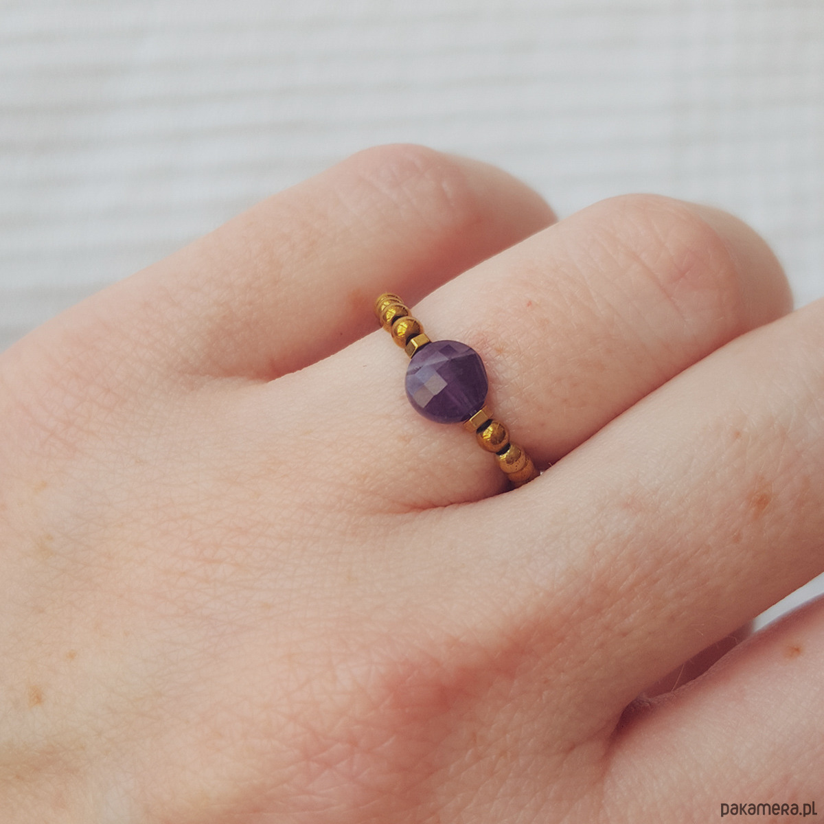 Pierścionek elastyczny wykonany z kamieni hematytu i oczka z ametystu. Obręcz pierścionka budują okrągłe hematyty w kolorze złotym. Element ozdobny to płaskie, fasetowane oczko z fioletowego ametystu. Każdy pierścionek jest niepowtarzalny ze względu na różne ametystowe oczka. Mogą być one całe fioletowe lub mieć jaśniejsze kremowe smugi albo wpadać w odcienie szarości – zawsze prezentują się wyjątkowo.