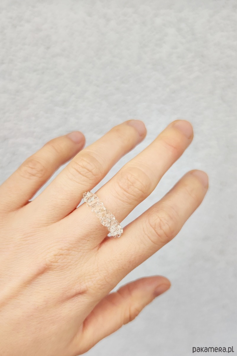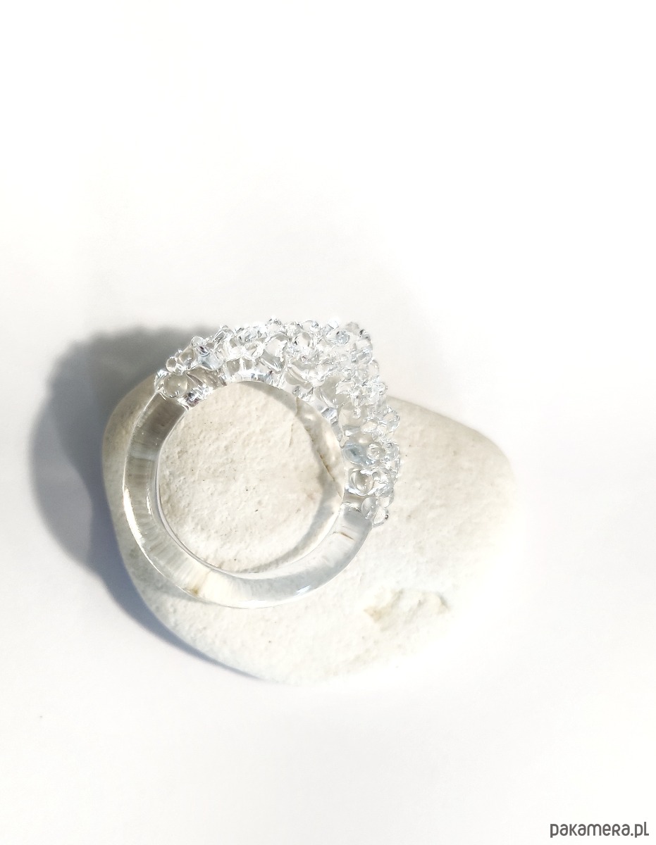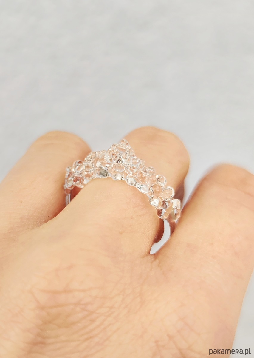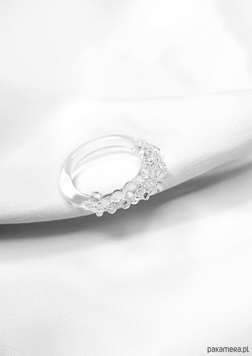 Delikatny pierścionek z wzorem z drobnym szklanych kropelek.