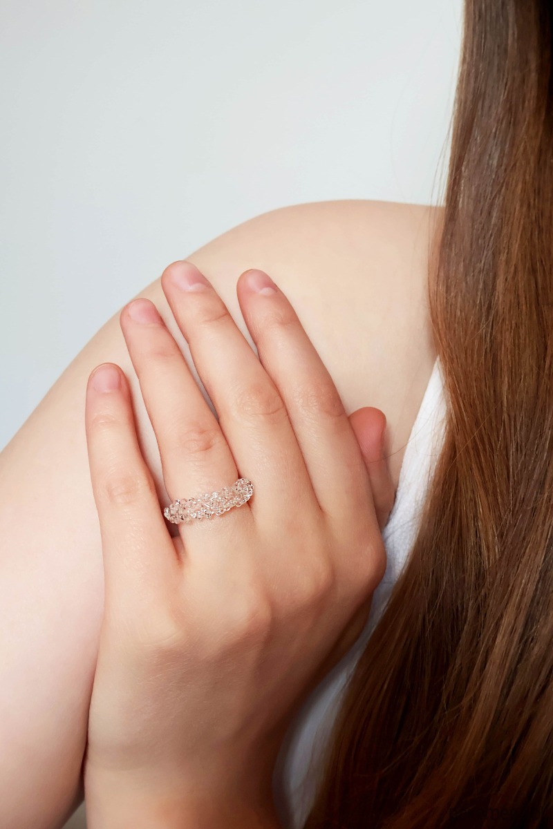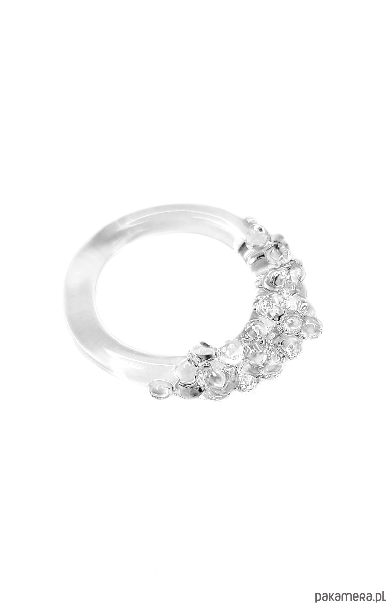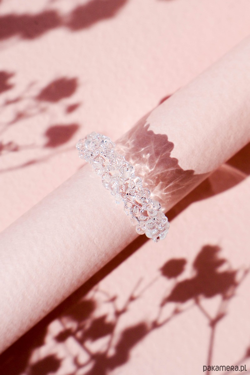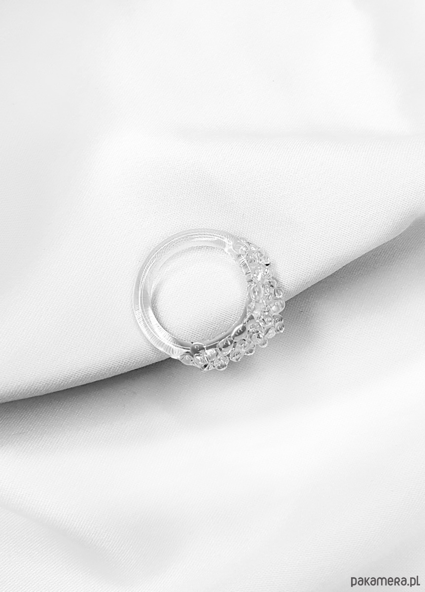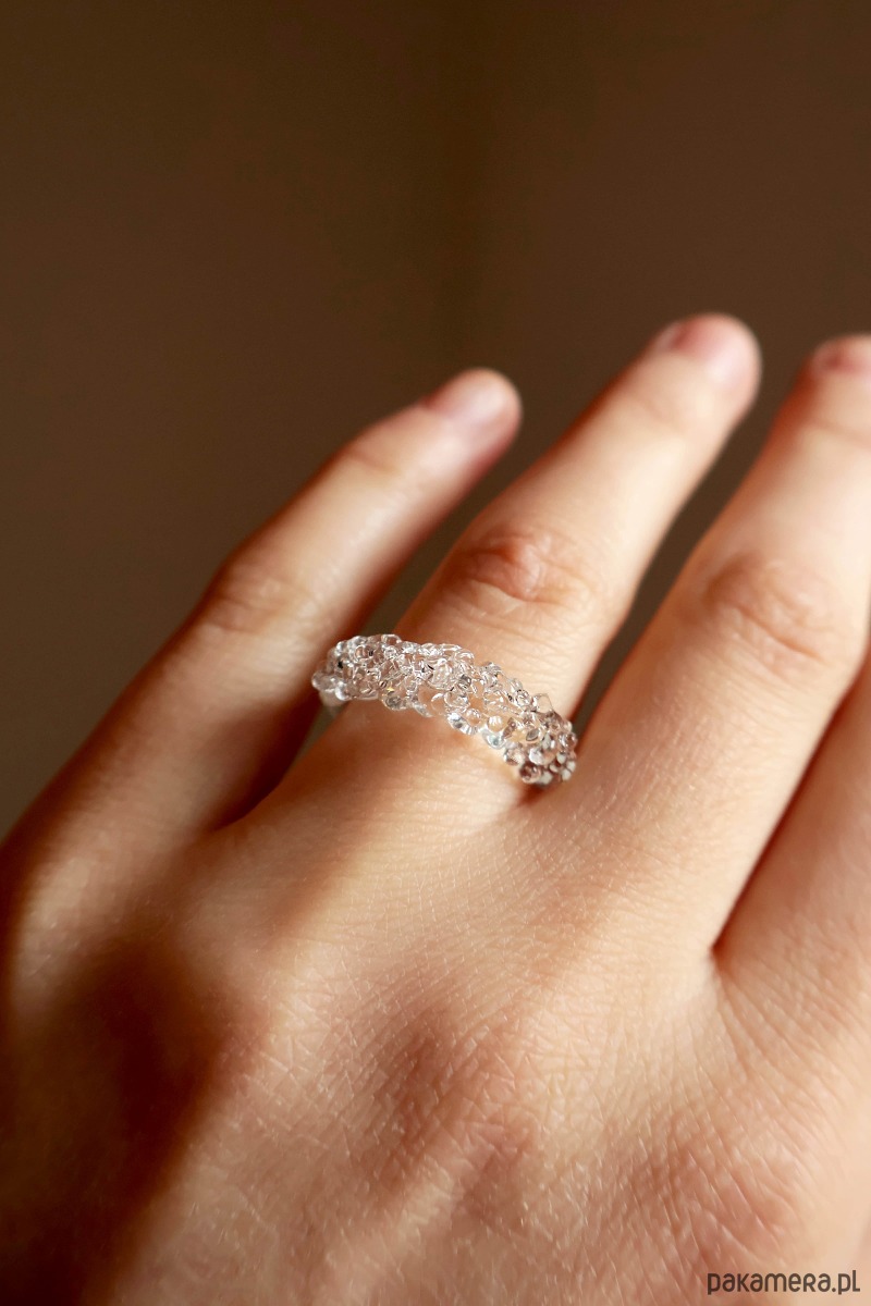 Delikatny pierścionek z wzorem z drobnym szklanych kropelek.