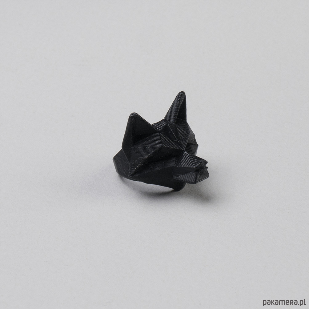 Pierścionek w kształcie lisa, wykonany z tworzywa sztucznego. Biżuteria tworzona jest przy użyciu technologii druku 3D oraz ręcznie wykończona. Wytrzymała i lekka, dzięki 30% wypełnieniu. Charakterystyczne dla druku 3D warstwy, tworzą wyjątkową fakturę, nadając biżuterii dodatkowych walorów estetycznych. Mimo niestandardowych gabarytów, pierścionek został zaprojektowany tak aby zapewnić użytkownikowi możliwie jak największy komfort podczas noszenia. Autorskie wzory ucieszą każdego, kto lubi bawić się swoim wyglądem oraz nosić oryginalną biżuterię.