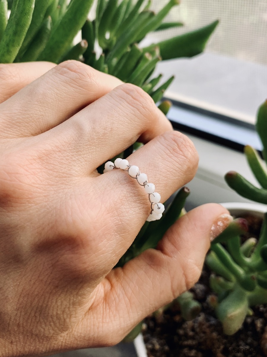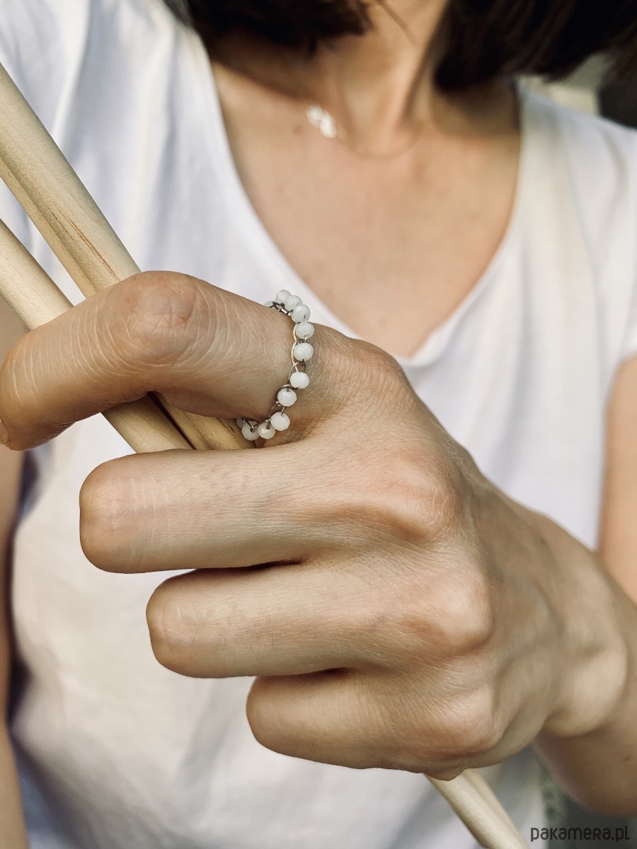 Minimalistyczny, drobniutki pierścionek własnoręcznie utkany/wypleciony z kryształków (w przepięknym, lśniącym kolorze śnieżnej bieli) i linki stalowej jubilerskiej najwyższej jakości.