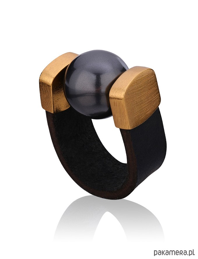 Pierścionek wykonany z czarnej skóry naturalnej oraz czarnej perły Swarovskiego w odcieniu Crystal Black Pearl w rozm. 14 mm. Okucia mosiężne, pozłocone 24 ct złotem. Szerokość paska skórzanego 10 mm.