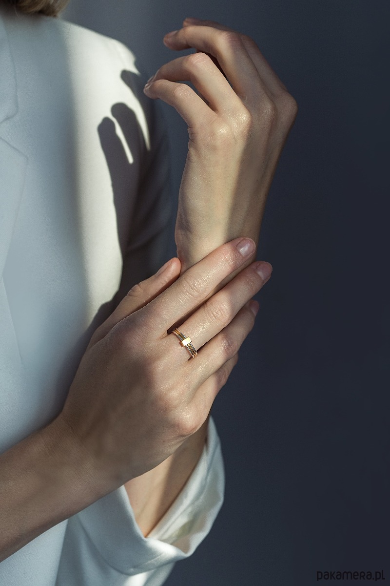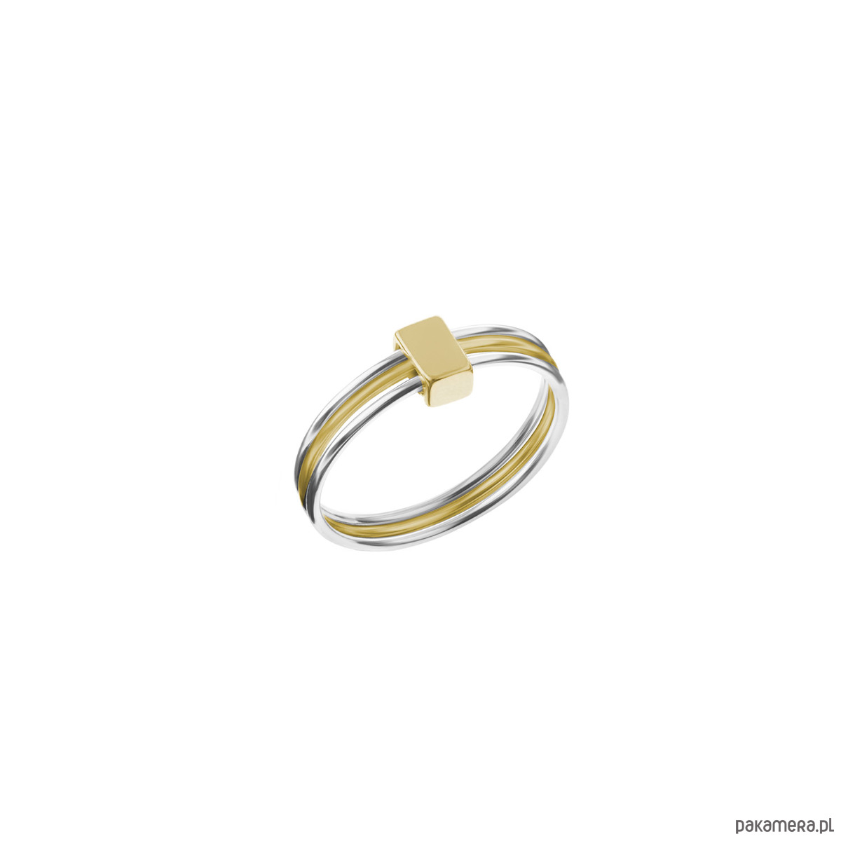 Pierścionek składający się z trzech ruchomych kółeczek połączonych złoconym prostokątem. Jedna wewnętrzna obrączka jest złocona, dwie zewnętrzne są srebrne. Unikatowy i wyjątkowo elegancki wzór. Doskonale prezentuje się samodzielnie, jak i w zestawie z innymi pierścionkami.
