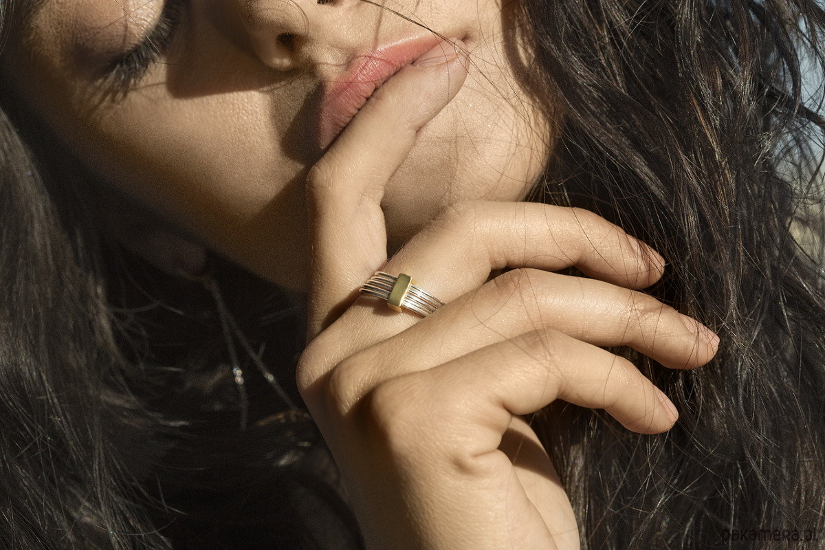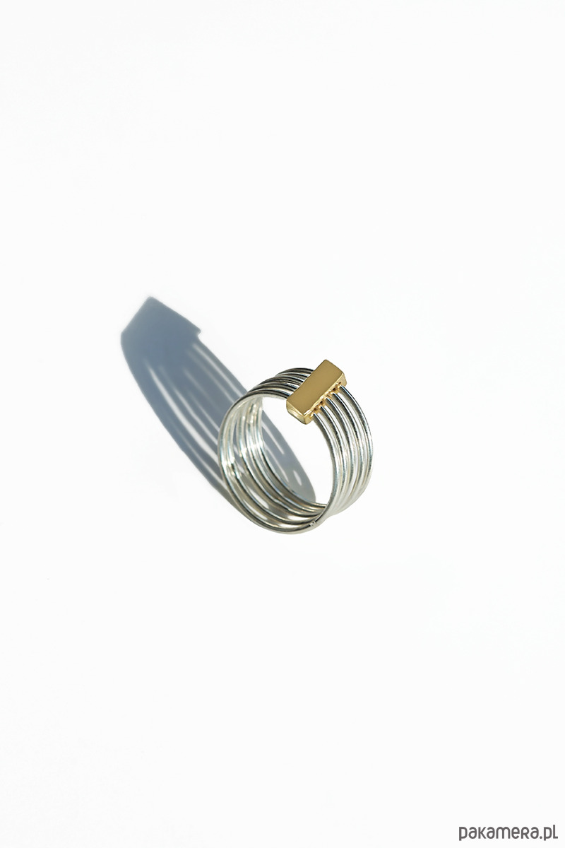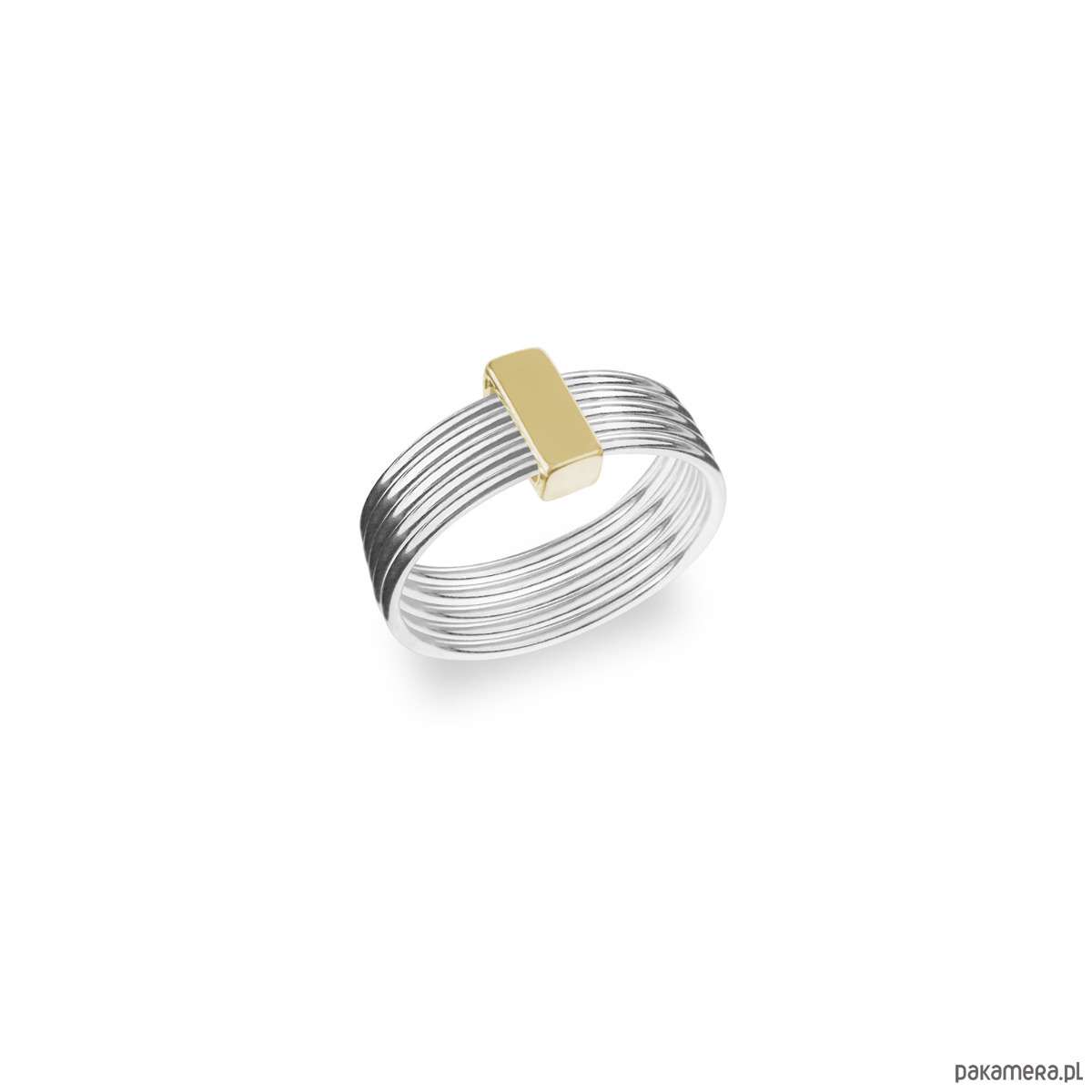 Pierścionek składający się z pięciu ruchomych kółeczek połączonych złoconym prostokątem. Unikatowy i wyjątkowo elegancki wzór. Doskonale prezentuje się samodzielnie, jak i w zestawie z innymi pierścionkami.