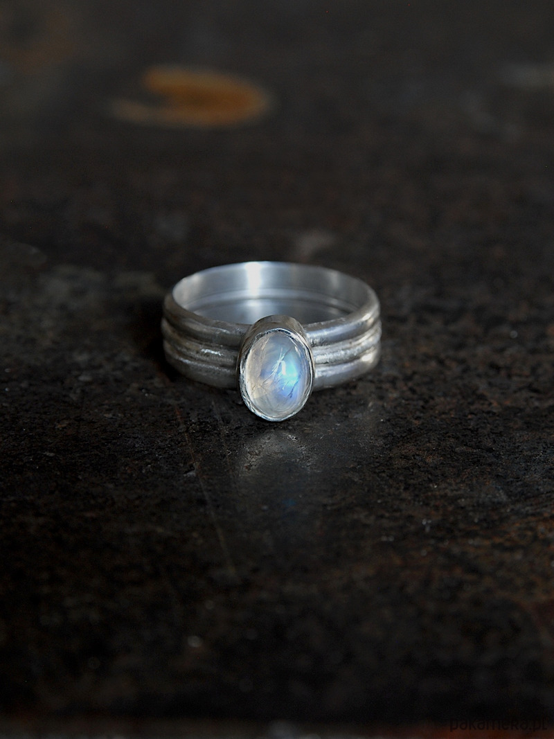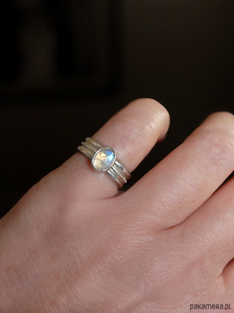 Wykonany ręcznie pierścionek z owalnym kamieniem księżycowym o szlifie kaboszonowym. Barwa kamienia to biały opalizujący. W zależności od kąta padania światła, kamień przybiera odcień niebieski i żółty. Przybliżone wymiary to 7x5 mm. Oprawę wykonałam ze srebra próby 925, obrączka jest złożona z 3 elementów, środkowa część o chropowatej powierzchni kontrastuje z gładkimi elementami. Szerokość obrączki to 6mm. Pierścionek mogę wykonać w dowolnym rozmiarze, na zdjęciu jest prezentowany pierścionek w rozmiarze 7. Pierścionek prześlę w eleganckim czarnym pudełeczku z logo.