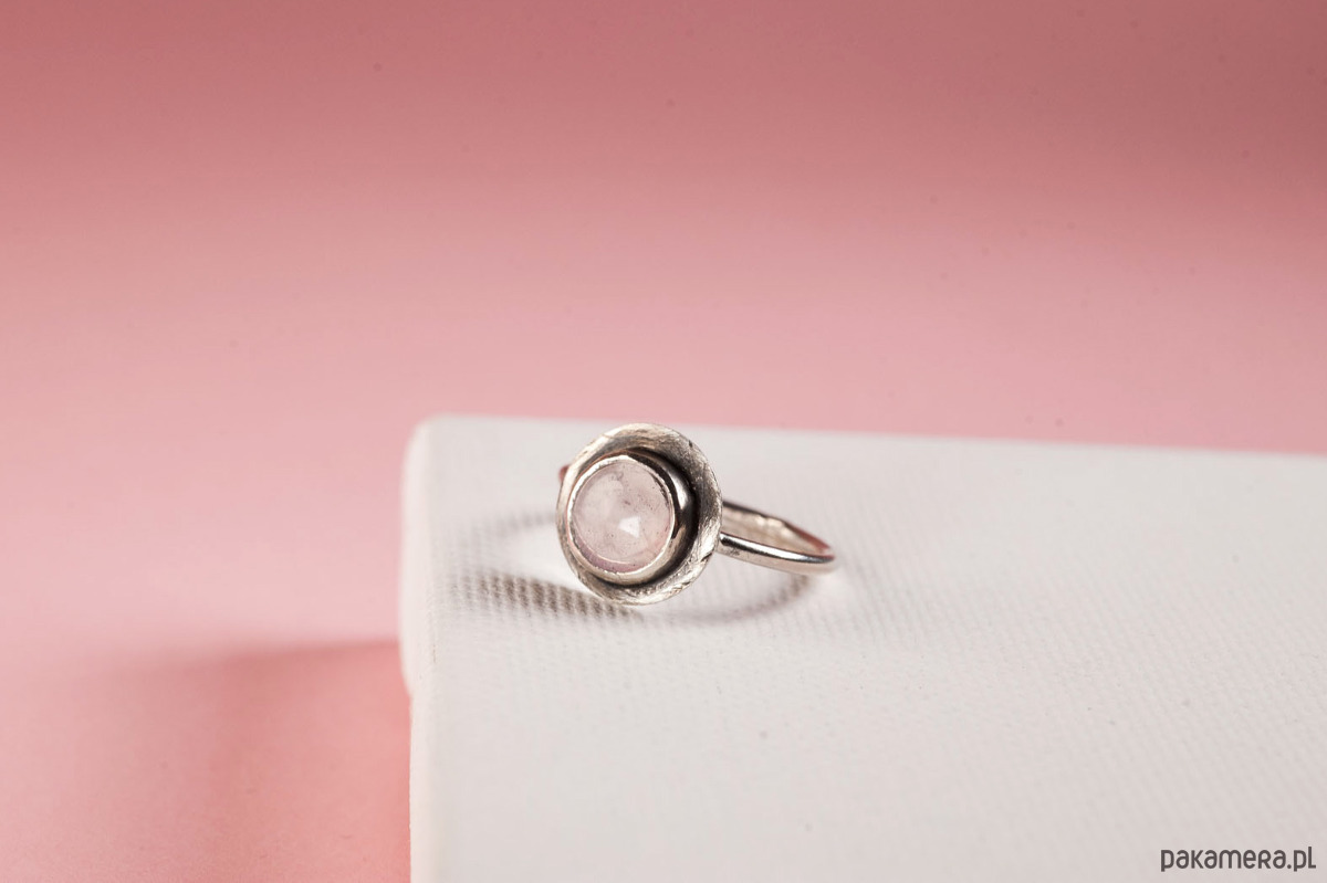 Pierścionek wykonałam własnoręcznie ze srebra próby 925. Sercem pierścienia jest naturalny kwarc różowy. Powierzchnia srebra pokryta została oksydą, co nadaje mu ciemniejszy odcień. Po dłuższym czasie użytkowania, oksyda może się lekko ścierać, to naturalne.