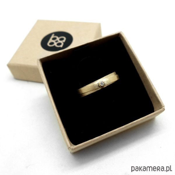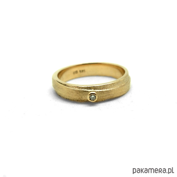 Delikatny pierścionek z żółtego złota próby 0,585 z 1,5 mm diamentem. Pierścionek szeroki na 4 mm. Jego powierzchnia jest delikatnie satynowana na zewnątrz i polerowana wewnątrz. Diament SI/H - do produktu dołączony jest certyfikat. Proszę podać swój rozmiar jubilerski lub średnicę wewnętrzną pierścionka po złożeniu zamówienia.