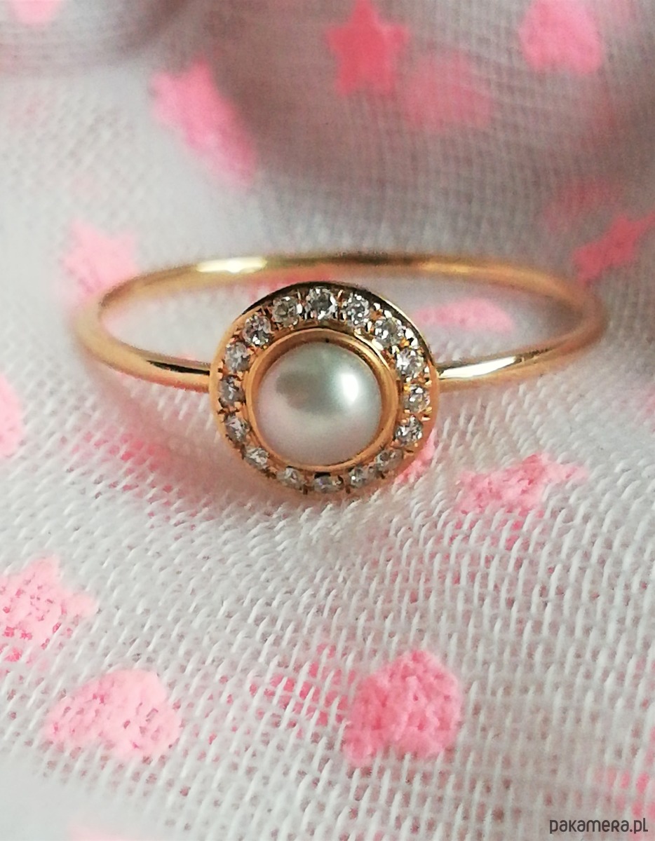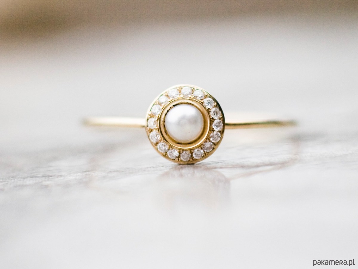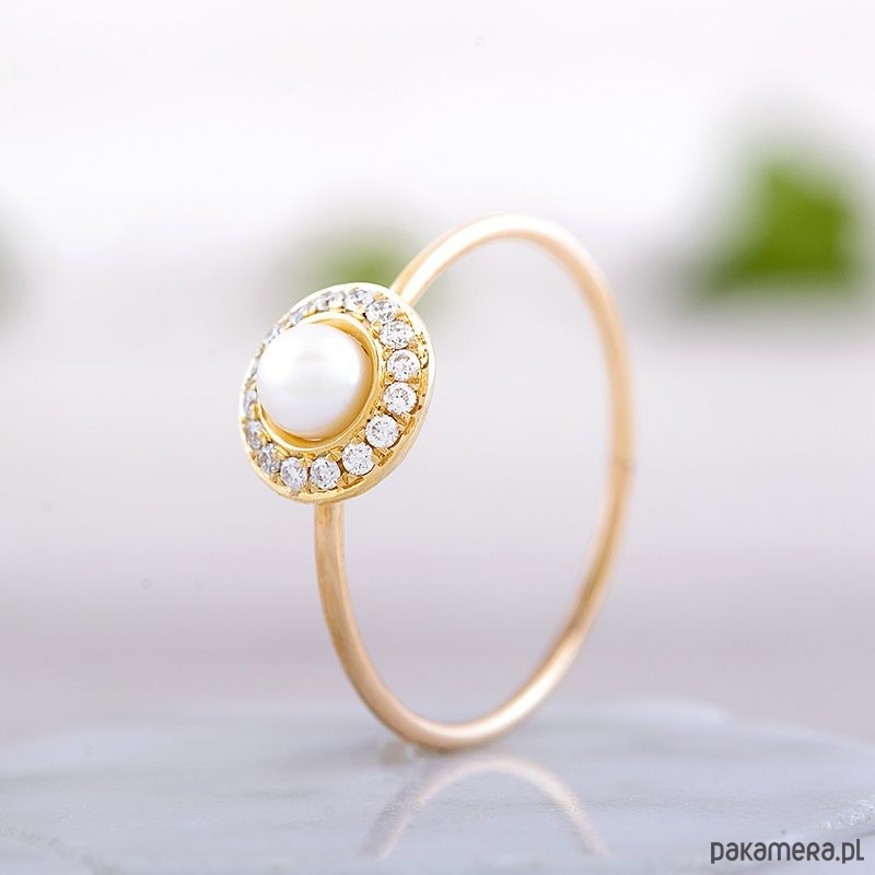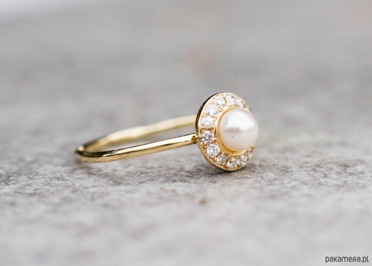 Przepiękny pierścionek zaręczynowy z białą naturalną perłą i diamentami w stylu VINTAGE wykonany ręcznie w żółtym złocie próby 585.