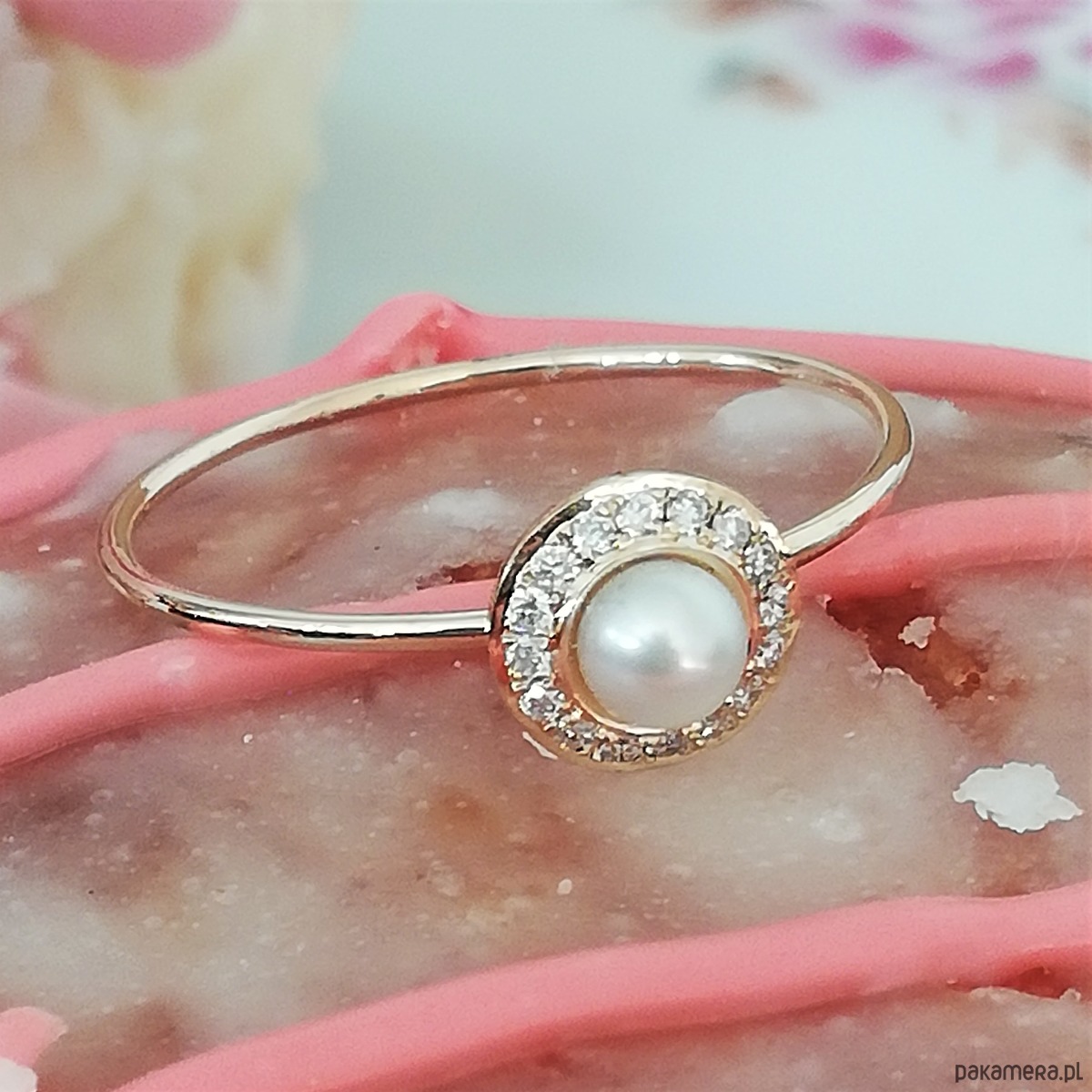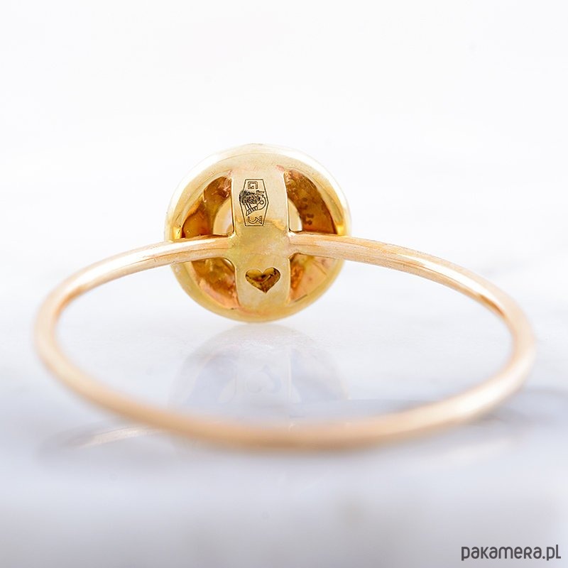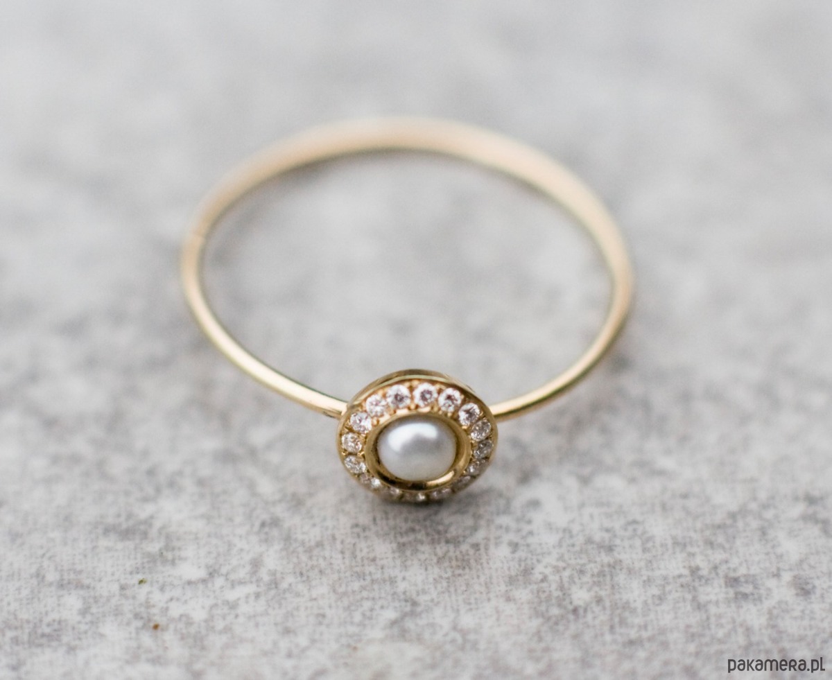 Przepiękny pierścionek zaręczynowy z białą naturalną perłą i diamentami w stylu VINTAGE wykonany ręcznie w żółtym złocie próby 585.